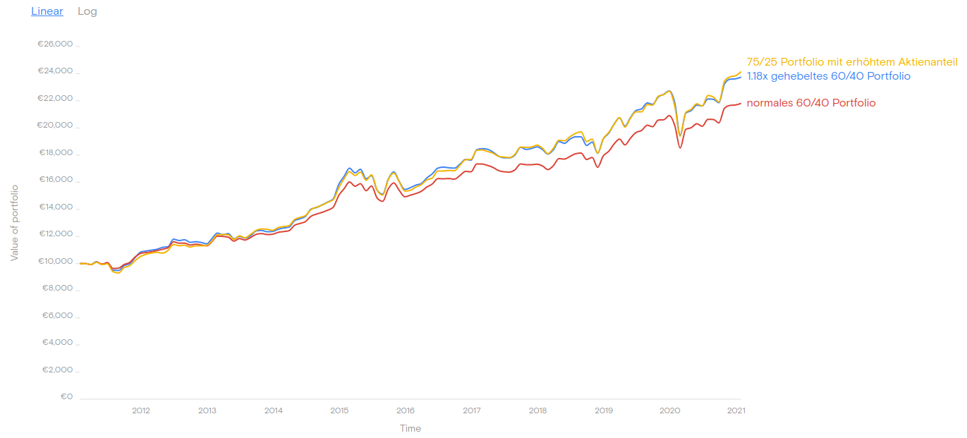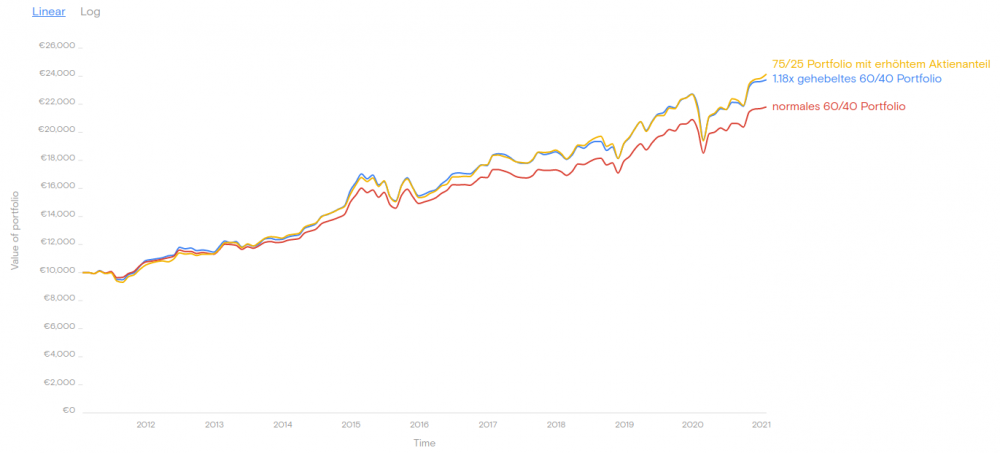 Ich glaube wir haben uns Missverstanden, ich habe nicht den Vergleich zu einem 60/40 Portfolio (oder 75/25) gemeint, sondern zu einem gehebelten 60/40 Portfolio. Im ARERO Thread war kürzlich die Diskussion, dass man in der Theorie das "optimale" risikoreiche Portfolio in seiner Gesamtheit hebeln sollte, also nicht nur 100% Aktien, deswegen meine Frage.