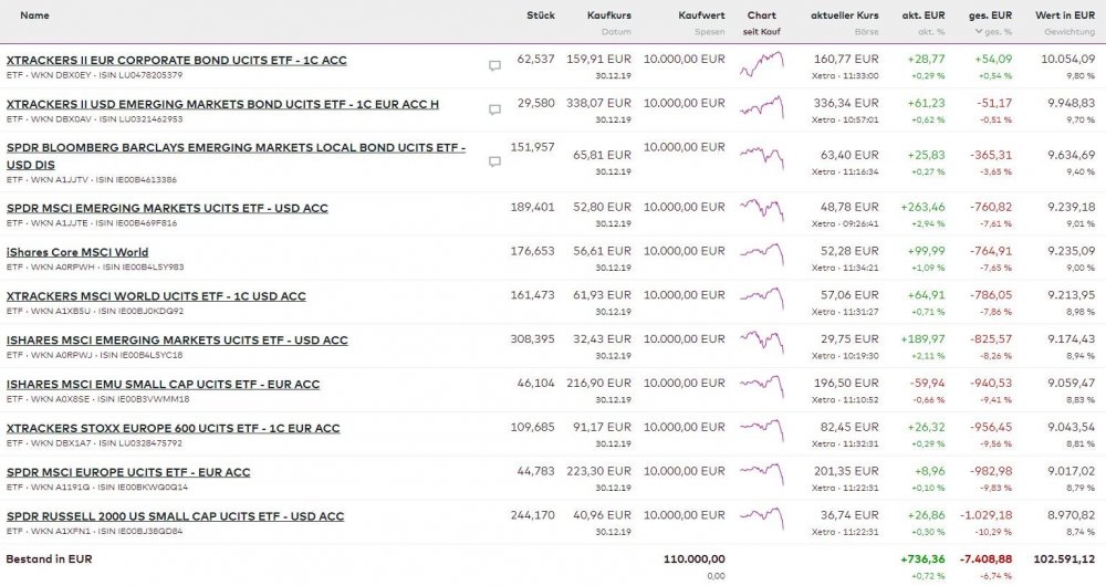 Schlumich April 1, 2020 vor 17 Minuten von chaosmuc: Ich hab jetzt noch abgewartet um die Verluste vom heutigen Tag mitzunehmen. Verglichen mit Schlumich schlage ich mich mit -19,50% hervorragend! (Siehe: Die Kunst adaptiv den passenden Benchmark auszuwählen!) Beim HSBC MSCI AC Far East Ex-Japan hat sich die WKN/ISIN geändert, da die deutsche ISIN vom Markt genommen wurde. Aber es ist der ETF hat sich nicht geändert, also kein Wechsel im Sinne des Reglements. Jeden Tag eine gute Tat, sagt der Pfadfinder..... Diesen Beitrag teilen Link zum Beitrag