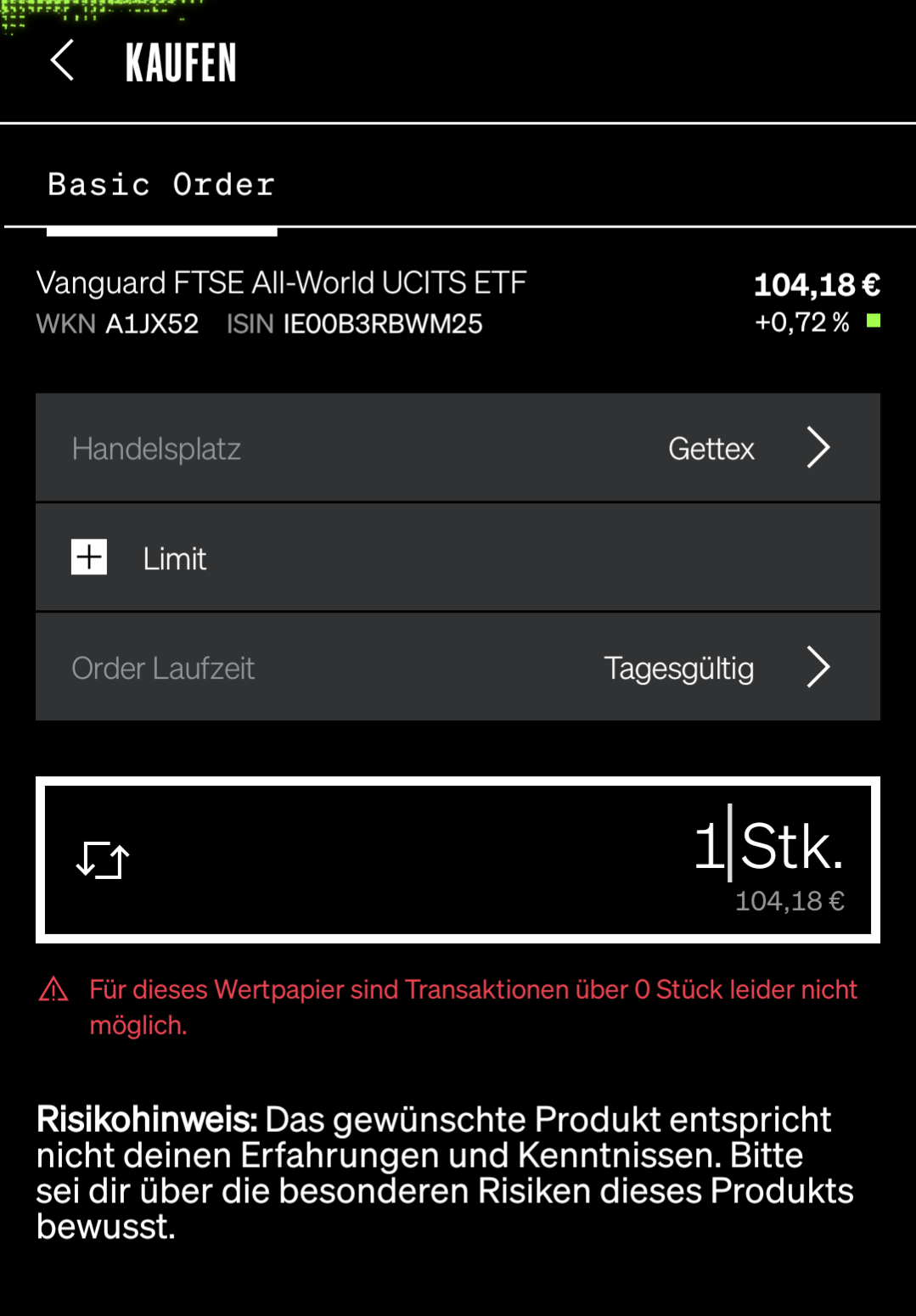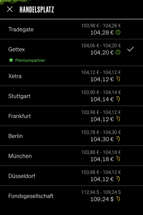 Hab mal einen Screenshot von der Ordermaske gemacht. Handelsplätze sind auf jeden Fall alle sichtbar. Order ist wohl noch nicht möglich, zumindest kommt eine Fehlermeldung wenn man mehr als 0 Stücke auswählt. Ich konnte bei Gettex auch nur Limit und kein Realtime-Order auswählen. Und es erscheint ein Risikohinweis, obwohl ich vorher das Quiz erfolgreich durchlaufen habe.