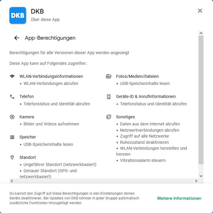 Die Berechtigungen, die die App will, liegen ungefähr auf dem Niveau anderer Banking-Apps. (Sind aber trotzdem erstaunlich umfangreich...)