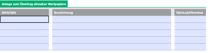 Ich beabsichtige, zumindest meine Anleihen zu meinem Consorsbank-Depot zu übertragen. Leider ermöglicht das entsprechende Formular lediglich den Übertrag von fünf Wertpapieren: