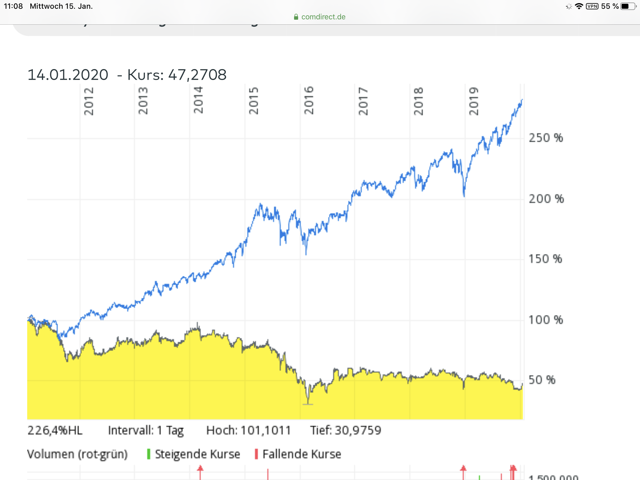 Gast240416 Januar 15, 2020 · bearbeitet Januar 15, 2020 von Cef vor 1 Stunde von Life_in_the_sun: Auch andere Investmentstile anerkennen, sofern sie erfolgreich sind. Ich warte weiterhin auf den Nachweis für das von Dir beispielhaft genannte Vehikel. Und ich weiß auch nicht, wo Du oder der Chart (was auch immer das für ein Chart ist) auf ein Kursplus kommst. Für den Steuerinländer gilt der von mir vorher verlinkte Chart ( in #77, Nasdaq, muss also noch in Euro feinkorrigiert werden) mit einem hohen Verlust von -15% in 2019, trotz der weltweiten Hausse von weit über +20%. Ganz schönes Delta. Ich wiederhole mich ungerne: „Bleiben wir aber doch einmal bei dem von Dir genannten US6915431026 . Ich lerne tatsächlich gerne dazu. Da wir ja von Altersversorgung sprechen: Uns würde sicher alle eine Aufstellung über 1 und 10 Jahre nach Kosten, Steuer und Inflation interessieren.“ In der Gafik nochmal der Nasdaq-Kurs (andere finde ich nicht) gegen den MSCI-World in Euro, der für den Steuerinländer die Benchmark sein dürfte: So ganz überzeugend finde ich die von Dir ins Feld geführte Anlagestrategie eigentlich nicht..... Aber das wird sicher alles durch Ausschüttungen so kompensiert, das es sich nach Steuern und Kosten lohnt? Wohlgemerkt: Das Gelbe ist das Wundervehikel, blau der MSCI WORLD Edit: Ergänzt Diesen Beitrag teilen Link zum Beitrag