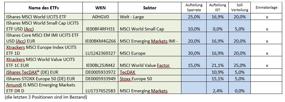 yggde Januar 14, 2020 Hallo Zusammen, die nächsten Wochen gilt es ein Fonds-Portfolio neu zu justieren, die letzten aktiv gemanagen Fonds sind bereits verkauft. Folgendes schwebt mit vor, Positionen auf weißem Hintergund sind Bestandspositionen. Angelehnt ist das ganze an die 50/30/20 Regel. 1. Erfahrungen mit Geldanlagen Investiere seit über 20 Jahren in Aktien und Fonds. Mit Aktien habe ich meine erste Immo finanziert –da war viel Glück im Spiel. Ansonsten das übliche: Festgeld, Sparpläne, strukturierte Produkte waren auch mal dabei etc. 2. Darstellung von bereits vorhandener Fondspositionen (Fondsbezeichnung und ISIN angeben): Depots bei Consors und DKB. Bestandspositionen siehe unten. 3. Zeitliche Aufwandsbereitschaft für eure Fondsanlage: 2-4 Stunden die Woche. 4. Risikotyp/Risikobereitschaft/Umgang mit Verlusten: Risikobereit und ich bin gespannt ob mich nach .com oder 2009 nochmals was schocken kann. Strategie ist vorrangig buy-and-hold- Pflichtangaben: 1. Anlagehorizont Mindestens 20 Jahre 2. Zweck der Anlage Das Depot ist das für Spielgeld im Alter. 3. Einmalanlage und/oder Sparplan? Mix aus Umschichtung und Sparplan 4. Anlagekapital: Aktuell im mittleren 5-stelligen Bereich. Sparplan dafür so 300-400 EUR/Monat. Nun zu meinem Vorhaben. Einmalanlage in die markierten Fonds, dann monatliche Sparraten mit der dazugehörigen Aufteilung. Einmalanlage MSCI Welt 25% MSCI World Value Factor 25% MSCI Emerging Markets IMI 20,0% MSCI Europe 20,0% (da gibt es schon Bestand) Sparplan MSCI Welt 40,0% MSCI World Small Cap 10,0% MSCI Emerging Markets IMI 20,0% MSCI Europe 30,0% ETFs dafür: iShares MSCI World UCITS ETF: A0HGV0 iShares MSCI World Small Cap UCITS ETF USD (Acc): IE00BF4RFH31 iShares Core MSCI EM IMI UCITS ETF USD (Acc) EUR: IE00BKM4GZ66 Xtrackers MSCI Europe Index UCITS ETF 1D: LU1242369327 Xtrackers MSCI World Value UCITS ETF 1C EUR:IE00BL25JM42 iShares TecDAX® (DE) EUR: DE0005933972 (bestand) iShares STOXX Europe 50 (DE) EUR: DE0005933949 (Bestand) Amundi IS MSCI Emerging Markets ETF DR D: LU1737652583 (Bestand) Und dann ein jährliches Rebalancing. Passt das so. Vorschäge? Vielen Dank im voraus für Eure Unterstützung. Und hier noch als Tabelle: Diesen Beitrag teilen Link zum Beitrag