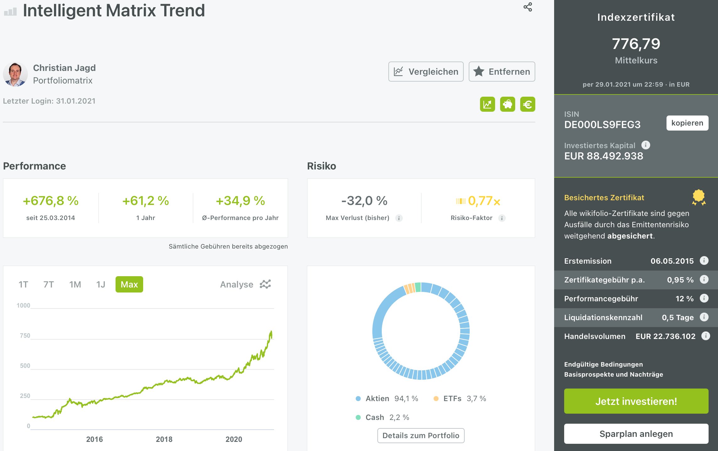 Der Heini Februar 3, 2021 Am 31.1.2021 um 11:54 von Toni: Bei Wikifolio.com hat sich der erfolgreichste Trader auf fast 90 mio hochgetradet.... da waren vor 6 Wochen „nur“ 60 mio drin, d.h. 50% Zuwachs an Investitionsgeldern in nur 6 Wochen! Es werden Zertifikate aufgelegt, die man über Lang&Schwarz handeln kann....krass... Find ich interessant, über fast 6 Jahre eine Durchschnittsrendite von 35% ist verdammt gut. Wenn ich mich nicht verrechnet habe gehen davon ca. 5% Gebühren runter, 1% fixe Gebühren und ca. 4% (= 35% x 12%) Performancegebühren. Da er sein eigenes Geld da drin hat, kommt hinzu, also wird er zwar riskant aber nicht zufällig investieren/traden. Riskant aber als Beimischung zur Performancesteigerung, warum nicht. Zudem hat er laut dem Interview auch in der Coronakrise gut gehandelt mit wenig Drawdown. Hat schonmal jemand ein Zertifikat von wikifolio gekauft und länger gehalten? Diesen Beitrag teilen Link zum Beitrag