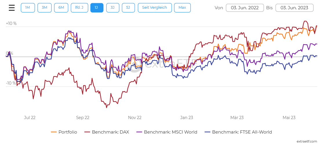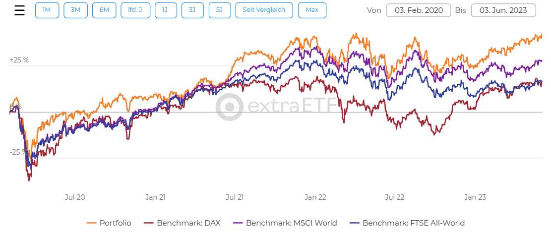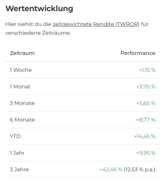 c23 Juni 3, 2023 · bearbeitet Juni 3, 2023 von c23 Hallo zusammen, nach längerer Zeit (Februar 2021) hier ein Update. Käufe: Februar 2021 - Oktober 2021: iShares NASDAQ 100 ACC (A0YEDL) via Sparplan monatlich Februar 2021: Kauf Hensoldt Oktober 2021: Kauf Linde Januar 2022 - jetzt: Einmaliger Kauf + Sparplan auf iShares MSCI World ACC (A0RPWH) Februar 2022: 5 verschiedene Cryptos hinzugefügt (Anteil insg. < 1,5 %) Ich bin mittlerweile aus Bequemlichkeit zu "buy and hold" übergegangen, also machte nichts weiter. Aktueller Stand: Chart - seit Februar 2020: Chart - letzte 12 Monate: Mit dem NASDAQ 100, Microsoft sowie den Anteilen im MSCI World besteht eine starke Betonung auf "Technologie". Das möchte ich noch besser ausgleichen, aber nicht durch Verkäufe, sondern durch Zukäufe. Der MSCI World hatte schlecht performt während meiner Zukäufe, aber insgesamt sieht es gut aus. Ich werde die nächsten Monate mal sehen, ob ich noch ein paar Aktien kaufe mit der monatlichen Sparrate, also anstelle des Besparens vom MSCI World. Diesen Beitrag teilen Link zum Beitrag