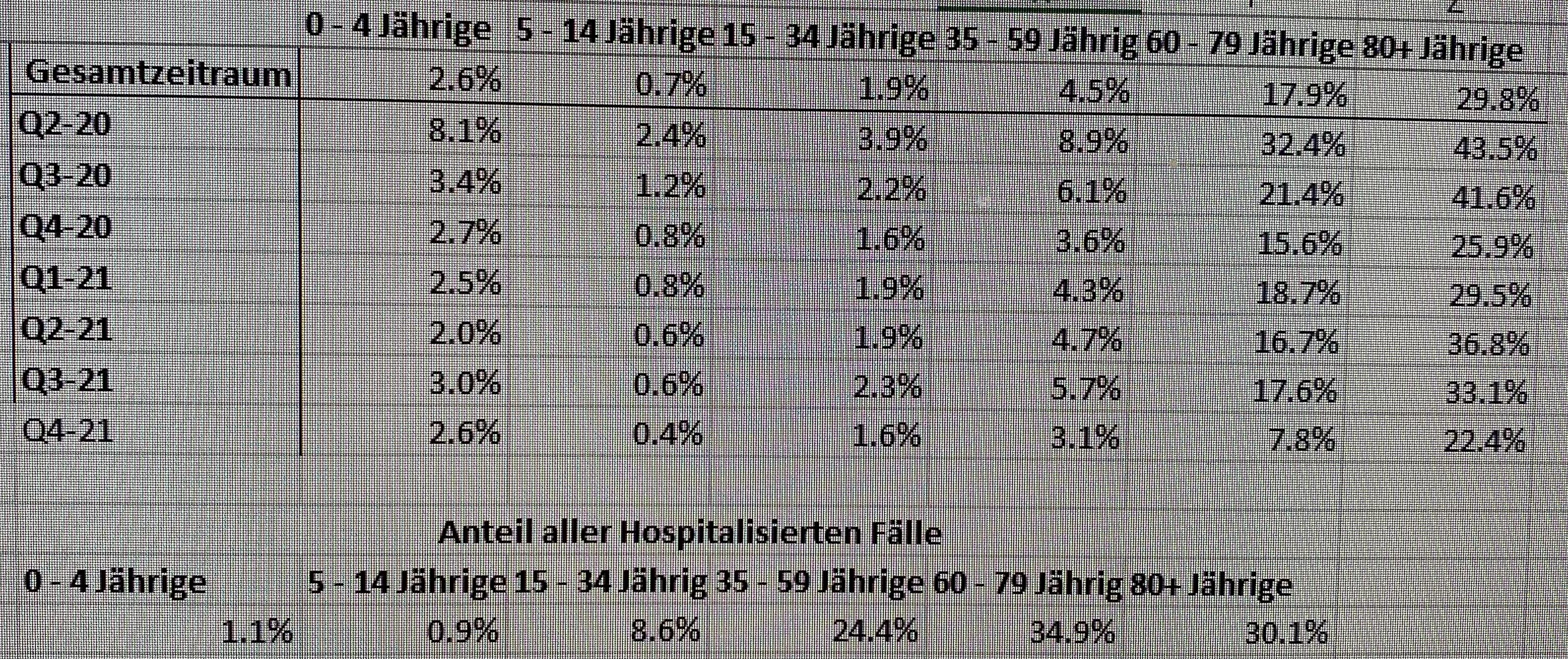 CorMaguire Oktober 25, 2021 · bearbeitet Oktober 25, 2021 von CorMaguire vor 10 Stunden von Fifty3: .... Doch gibt es auch. Kann man anhand der Daten aus dem RKI ausrechnen. Verschlüsselt nach Alter die Wahrscheinlichkeit hospitalisiert zu sein (nicht Intensivstation). Auch wie sich diese über den Zeitraum verändert hat. Einen wirklichen Effekt der Impfung sieht man da irgendwie noch nicht. Aber mal schauen wie es sich entwickelt. Quelle: RKI. Daten zum Download (Siehe Link oben) und selber rechnen. Rechnung: Anzahl Hospitalisierter Fälle innerhalb der Altersgruppe / Anzahl Positiver Tests innerhalb der Altersgruppe ... Aus der Tabelle ergibt sich doch glasklar, dass die Impfung kontraproduktiv ist, da der größte Rückgang (von Q2/20 --> Q3/21) in den Altersgruppen 0-4 (- 63%) bzw. 5-14 (-75%) liegt, die ja ganz/größtenteils ungeimpft sind. Oder die "Rechnung" ist vielleicht zu einfach. * Ist der der prozentuale Anteil der getesteten in allen Quartalen gleich hoch (und die Teststrategie gleich)? * Die Differenzierung nach geimpft/ungeimpft unter Berücksichtung der Impfquote in den Altersgruppe wäre m.E. auch hilfreich. Sonst könnte es ja sein, dass einfach noch genug ungeimpftes Potential vorhanden ist. Oder ich hab das alles falsch vestanden. Diesen Beitrag teilen Link zum Beitrag