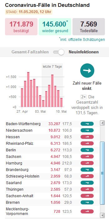 DrFaustus Mai 11, 2020 vor 2 Minuten von dev: Das schien je nach Bundesland anders zu sein: Die Daten von der Morgenpost basieren auf einer anderen Datenbasis als die des RKI. Das RKI hat nur dort gemeldete Fälle. Die Redaktion der Morgenpost trägt meines Wissens Daten der Länder zusammen. Das kann abweichen. Diesen Beitrag teilen Link zum Beitrag