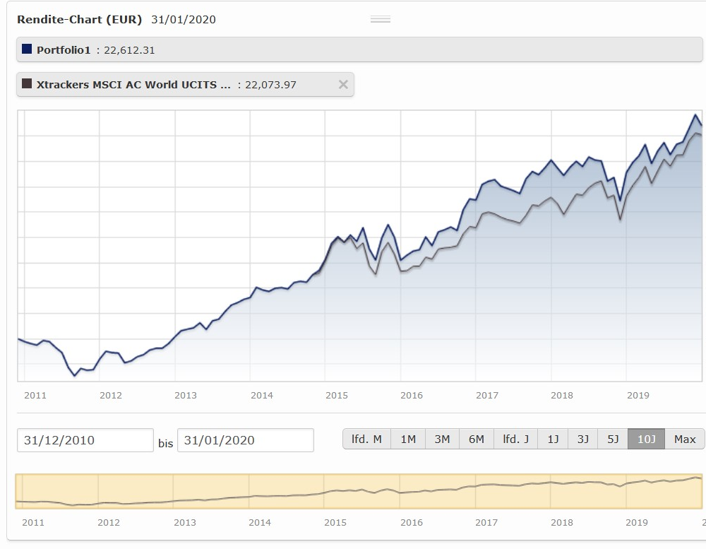Wuppi Februar 9, 2020 · bearbeitet Februar 9, 2020 von Wuppi vor 25 Minuten von Steve777: Bei Vergleichen mit dem Xray-Tool ist UNBEDINGT (!!!) folgendes zu beachten, um sinnvolle Vergleichsergebnisse zu bekommen: ALLE (!!) einzelnen ETFs des eigens zusammengestellten Portfolios müssen unbedingt ein ähnliches Auflagedatum haben, welches möglichst weit zurückreicht, da sonst das komplette (Chart-)Ergebnis massiv verfälscht wird. Ich hab deine Short-List-ETFs noch nicht alle "durchgecheckt", aber allein schon der unterste (Lyxor China) wurde erst 2018 aufgelegt. => Er wird in deinem 10-Jahres-Chart oben vor 2018 nicht korrekt berücksichtigt. Das Xray rechnet ihn also einfach heraus. Was noch passieren kann beim Xray: Unten bei den Daten - wenn du bei einigen ETFs leere Stellen sind von den Zahlen her (Sharpe Ratio oder Mittelwert), dann hat das Xray diesen ETF auch nicht richtig verarbeitet. Fazit: Bei Vergleichen mit Xray müssen bei JEDEM ETF unbedingt unten ALLE Zahlendaten komplett ausgefüllt sein UND die ETFs des Portfolios müssen ALLE möglichst lang zurückreichen von der Auflage, damit man dann zumindest diesen Zeitraum vergleichen kann gegen einen MSCI World Benchmark z.B. Daher konnte ich z.B. in meinem Musterdepot "QUINTETT" auch nur bis 2013 zurückgehen und nicht einfach 10 Jahre, weil der jüngste ETF in meinem Portfolio erst Ende 2012 aufgelegt wurde. Bitte auch aufpassen, dass wenn du die ETF's im Tool eingibst, du nicht zufällig den Fonds auswählst der eine andere Währungseinheit als die geüwnschte hat. Auch das führt dazu, dass es die Ergebnisse massiv verfälscht werden. Diesen Beitrag teilen Link zum Beitrag