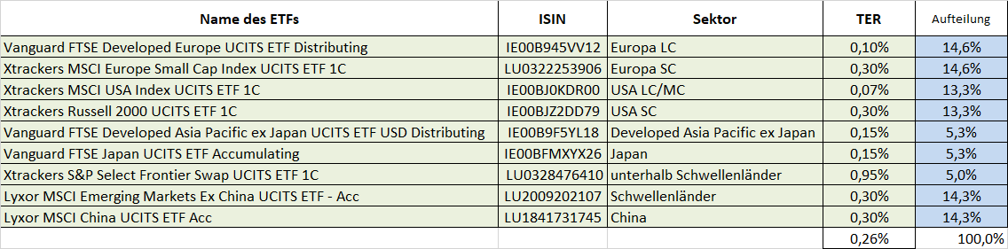 DST Februar 9, 2020 · bearbeitet Februar 9, 2020 von DST vor 9 Minuten von pillendreher: Gewiss ist für mich nur, dass ich zu 99,99% in 50 Jahren nicht mehr hier bin. Und weil auch die nähere Zukunft bekanntlich ungewiss ist, deckt der weitblickende Anleger den Aktienanteil mit dreierlei Gewichtungsvariationen ab: -> e.g. Arero WKN: DWS0R4 (BIP) - Vanguard FTSE Developed World WKN: A12CX1 (MCap ex Emerging) - VanEck Vector Global Equal Weight WKN: A1J01T (Equal Weight) Das 9-ETF-Portfolio von @yggde entspricht vermutlich mehr dem aktuellen BIP als der Arero, der auf meinem 4-ETF-Vorschlag basiert. Diesen Beitrag teilen Link zum Beitrag