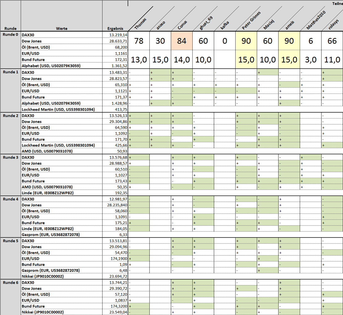 Thomas Februar 14, 2020 Hallo zusammen, eine weitere Börsenwettrunde beginnt. Viel Spaß beim Wetten. Tippabgabe bis Montag 17:00 Uhr --> 7. Runde von 11 Runden. Neue Startwerte und Veränderung aus der letzten Runde: 1. DAX30: 13744,21 (+) 2. Dow Jones: 29390,72 (+) 3. Öl (Brent, USD): 57,12 (+) 4. EUR/USD: 1,0837 (-) 5. Bund Future: 174,32 (+) 6. Nikkei (JP9010C00002): 23549,04 (+) 6. (Neu) Bitcoin (USD): 10380,66 Informationen: Erst Tippabgabe! Danach können weitere Beiträge verfasst werden. Anders herum wird disqualifiziert! Die ersten 5 Werte stehen während der ganzen Tippsaison fest. Der 6. Wert wechselt von Runde zu Runde. Vorschläge für einen 6. Wert werden jederzeit entgegengenommen. Es dürfen jederzeit auch neue Spieler einsteigen und sich am laufenden Spiel beteiligen. Regeln:https://www.wertpapier-forum.de/topic/368-regeln-und-informationen-für-die-börsenwette/ Fragen:https://www.wertpapier-forum.de/topic/1420-fragen-zur-börsenwette-hier-rein/ Bitte die Tipps im vorgegebenen Format abgeben! So sieht der richtige Code als Beispiel aus: [hide ] (hier das Leerzeichen noch entfernen vor "]") 1. + 2. - 3. - 4. + 5. + 6. - [/hide] Mein Tipp Versteckter Inhalt Du kannst den versteckten Inhalt sehen, sobald du auf dieses Thema antwortest. Diesen Beitrag teilen Link zum Beitrag