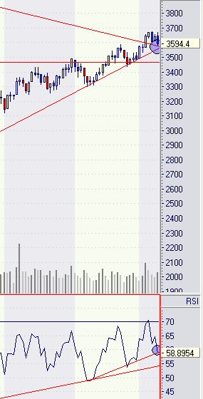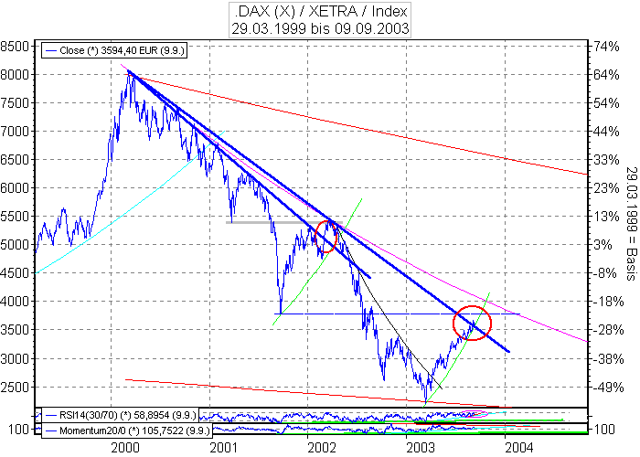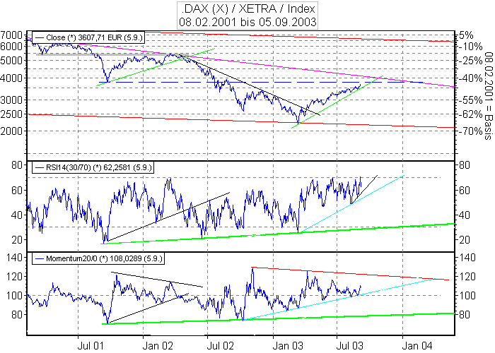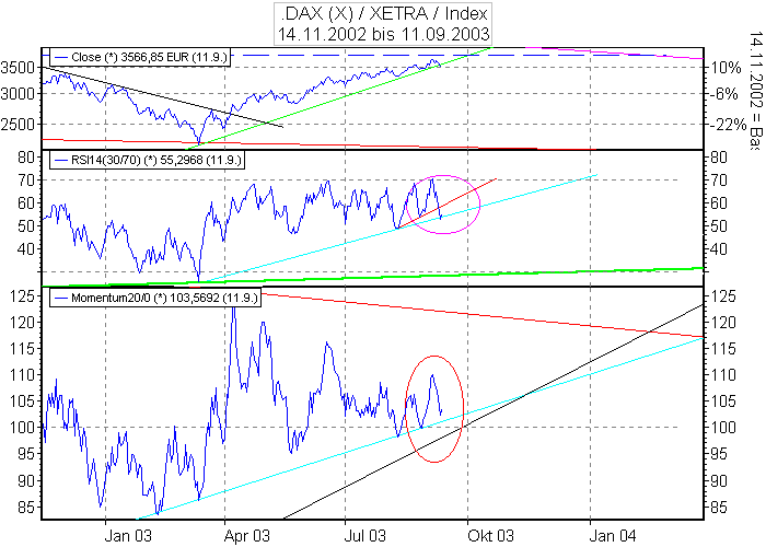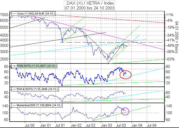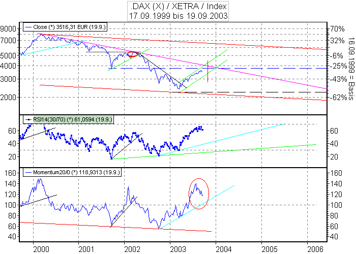Aktiencrash September 26, 2003 Auf Tagesbasis hat der RSI noch Luft nach unten (hellgrüner Kreis). Bei 3282 Punkte könnte eine horizontale Unterstützung (schwarz gestrichelt) liegen. Eine weiter Unterstützung könnte die untere hellgrüne kurze Aufwärtstrendlinie sein. Im oberen Bereich liegt ein kleiner kurzer Abwärtstrend (schwarz). Dieser könnte auch noch mal einen Angriff aushalten. Ich denke mal das es zwischen 3200-3500 Punkte für 2 Wochen seitwärts geht. Erst ab Mitte-Ende Oktober kann man wohl noch einmal mit einer Weinachtsrally rechnen . Kursziel weiterhin 4000 Punkte . Diesen Beitrag teilen Link zum Beitrag