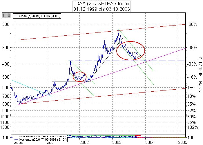 Aktiencrash Oktober 5, 2003 Hier mal eine kurze Analyse für den DAX. Diese ist natürlich schön aufbereitet . Wie man sieht, wandert der DAX im kurzen Aufwärtstrendkanal (hellgrün) auf die ander Seite. Dieses tat er auch im vorletzten Trendkanal 2001-2002 (roter Kreis rechts) Die how ist noch lange nicht vorbei. Allerdings dürfte das Kursziel jetzt nur noch zwischen 3922-3860 zwischen Ende Okt-Dez 2003 liegen. Hier dürfte die violette Linie (mittelfristiger Abwärtstrend) erreicht sein. Diesen Beitrag teilen Link zum Beitrag