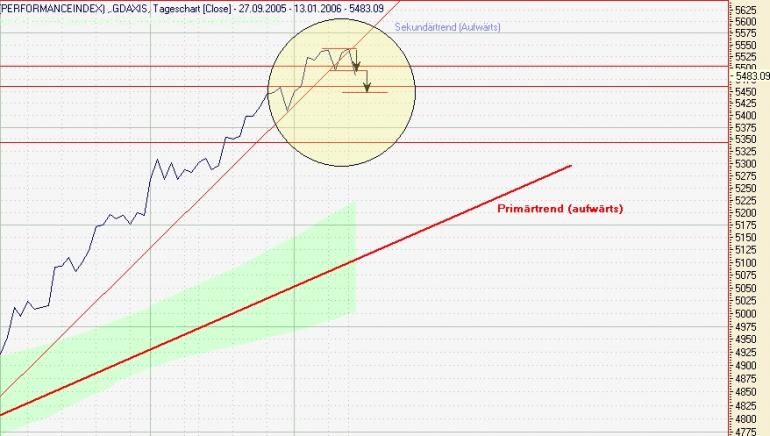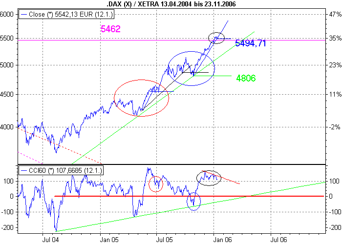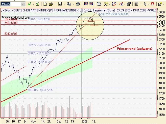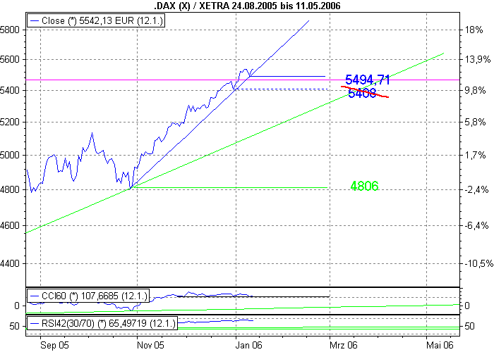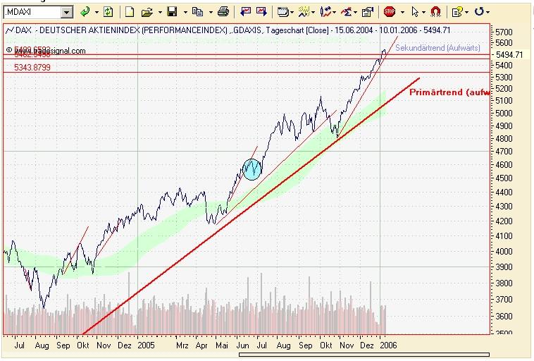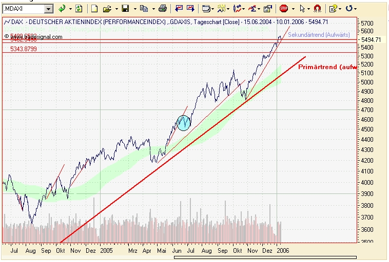 Aktiencrash Januar 12, 2006 Da ein neues Hoch generiert wurde im Dax, steigt die horiz. Unterstützung auf 5408 Punkte (5286) für den Sekundärtrend (blau). Die horiz. Unterstützung des Primärtrend (grün) bleibt weiterhin bei 4806 Punkte. Der Dax hat ein neues Hoch generiert ! Somit steigt die horiz. Unterstützung des Sekundärtrend (blau) von 5408 auf 5494,71 Punkte. Die horiz. Unterstützung des Primärtrend (grün) bleibt weiterhin bei 4806 Punkte bestehen. Fazit: Der sekundäre Aufwärtstrend bleibt bis zum Durchbruch der horiz. Unterstützung von 5494,71 Punkte intakt . Diesen Beitrag teilen Link zum Beitrag