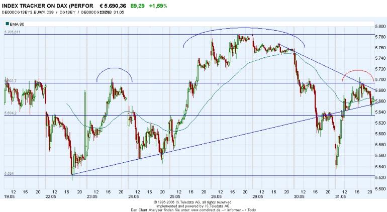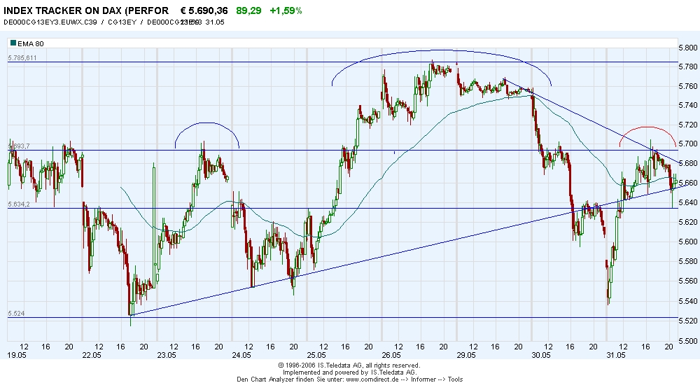 AdrianHG Mai 31, 2006 Hier mal eine Intraday-Sicht (letzten 10Tage) vom Dax und meine Meinung dazu. An sich würde ich nach Analyse des Chartbildes ganz klar auf einen fallenden Dax in den nächsten Tagen tippen. Man kann deutlich ein Rounding-Top erkennen. Wer es erkannt hat, konnte einiges an Gewinn mitnehmen. Im Übrigen kann man ins Chart-Bild eine SKS-Formation erkennen, die auf weiter sinkende Kurse deutet. Allerdings sollte man hier auf jeden Fall auf die Bestätigung warten (Bruch der Nackenlinie). Was mich persönlich noch am "Short" hindert, ist der starke Schluss des Dows (+0.67) und vor allem der starke Anstieg in den letzten paar Minuten vor Handelsschluss. Daher rechne ich, trotz des Chart-Bildes, mit einer pos. Eröffnung im Dax morgen. Sollte der Dow aber später im Minus öffnen, spekuliere ich ganz klar auf einen starken Abverkauf im Dax. Ich bin gespannt, ob an meiner Analyse was dran ist. Grüße Adrian Diesen Beitrag teilen Link zum Beitrag