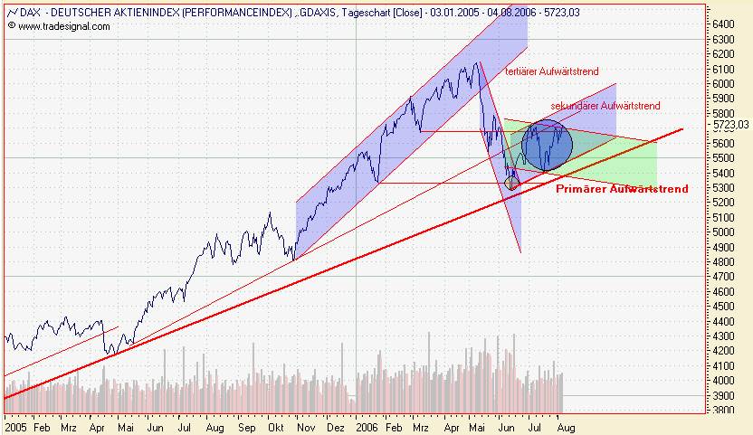 Onassis August 4, 2006 Wenn die letzten Wochen (Kreis dunkelblau) eine W-Formation ergeben, dann spricht das für steigende Kurse. Sieht zwar ein wenig verkrüppelt aus, könnte aber noch durchgehen. Und dann ist die Frage, welcher Trendkanal genommen wrid: 1. Der Aufwärtstrendkanal (ist IMO wahrscheinlicher) 2. der Abwärtstrendkanal (wurde heute nach oben mit EOD um ein paar Punkte durchbrochen) Für nächsten 2 Wochen rechne ich mit einer Bewegung des DAX im Aufwärtstrendkanal. Längerfristig (bis zu 6 Monate) sehe ich den DAX aber wieder bei 5.500 (nahe beim primären Aufwärstrend) Onassis Diesen Beitrag teilen Link zum Beitrag