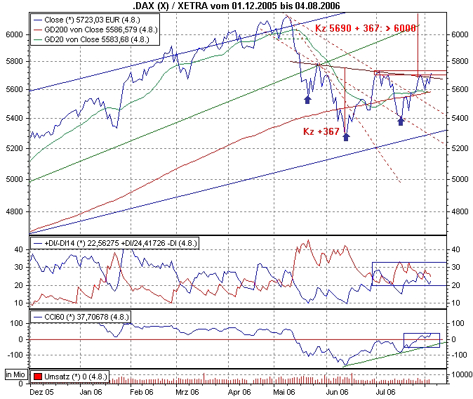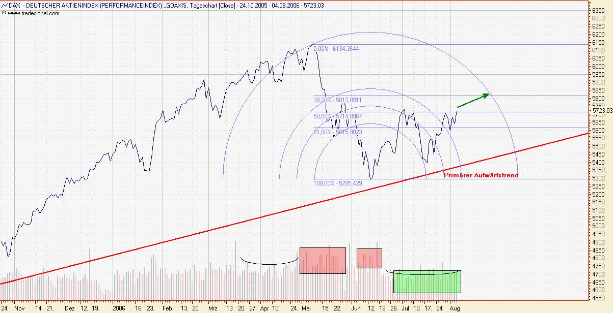 et3rn1ty August 4, 2006 Der Dax hat heute den wichtigen Widerstand bei 5.700 Punkte und damit ebenfalls die letzte Begrenzung der Fibonacci Arcs durchbrochen. Nächster Widerstand wäre somit die Marke 5.788 Punkten. Sollte dieser nachhaltig gebrochen werden können, ist der Weg bis zu den alten Jahreshochs frei. Grüße, et3rn1ty. Diesen Beitrag teilen Link zum Beitrag
