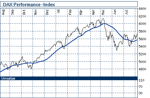 et3rn1ty August 7, 2006 Update: Bei der Marke von 5.639 scheint sich eine stärkere Unterstützung auszubilden. Diese sollte auch EOD nicht mehr unterschritten werden, da sonst neues Abwärtspotential gebildet werden kann. Ansonsten ein unverändertes Bild. Die moderaten Umsätze lassen noch keine weitere Topbildung zu. Dieses wird wahrscheinlich erst der Fall sein, wenn in Amerika der Handel startet. Wird die Marke von 5.665 Punkten überwunden, ist der Weg frei nach oben. Ein weiterer Test der 5.700 Marke dürfte dann wieder drin sein. Grüße, et3rn1ty. Diesen Beitrag teilen Link zum Beitrag