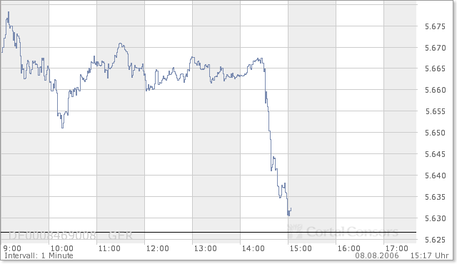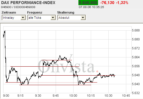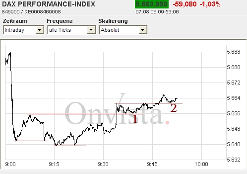 et3rn1ty August 7, 2006 Das auf die Dax-Indikationen kein Verlass mehr ist, wurde gerade heute morgen wieder jedem klargemacht. Die Indikationen standen vorbörslich bei 5.641, sogar der Dax-Future (5.665 um 8:45h) ging von einem tieferen Start in den Handelstag aus. Eröffnet hat der Dax bei 5.685 Punkten. Ansonsten dürfte der Handelstag eher ruhig verlaufen heute. Private Investoren werden sich wohl noch mit ihren Kauf- bzw. Verkaufsorders zurückhalten vor der morgigen Zinsentscheidung. Für Daytrader allerdings ist heute ein idealer Tag. Wie man sieht, wurden heute früh mehrere Double-Bottoms gebildet. Auch bei Durchbruch eines Intraday-Widerstandes wurde dieser mit anschließender Bodenbildung bestätigt (1 und 2 im Bild). In der ersten Handelsstunde war es also einfach ein wenig Geld zu verdienen. Grüße, et3rn1ty. Diesen Beitrag teilen Link zum Beitrag
