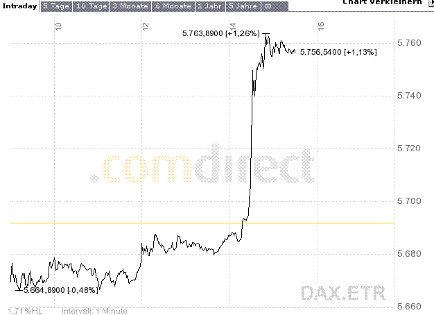 et3rn1ty August 15, 2006 Wer hätte das gedacht, dass der Dax heute so ausbricht. Sollten morgen die Verbrauchpreise ähnlich ausfallen wie heute die Erzeugerpreise, dann sehe ich gute Chancen an den nächsten Widerstand bei 5898 heranzulaufen. Grüße, et3rn1ty. Diesen Beitrag teilen Link zum Beitrag