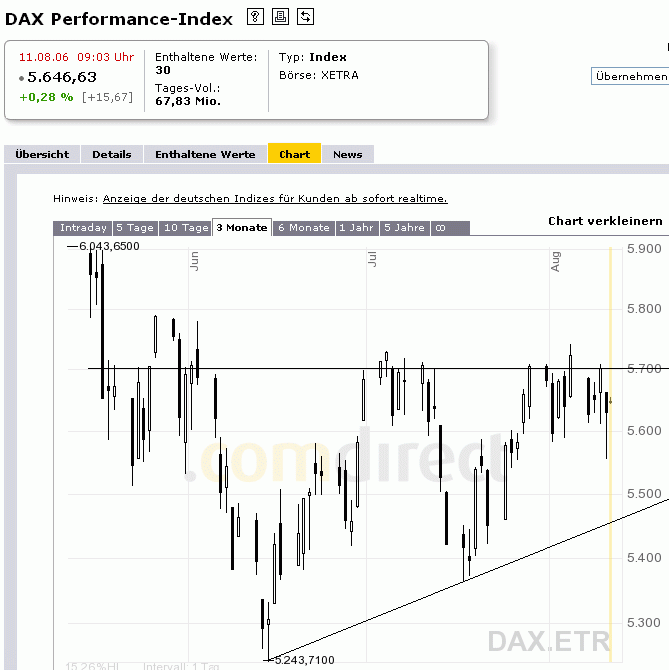 Toni August 11, 2006 · bearbeitet August 11, 2006 von Toni Ich finde, der DAX hat ein schönes "aufsteigendes Dreieck" gebildet. Ich rechne ca. Ende August mit einem Ausbruch nach oben. Evtl. sehen wir wohl die 5500 nochmal... Diesen Beitrag teilen Link zum Beitrag