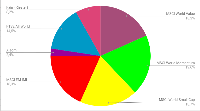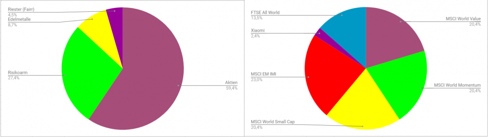 Bigwigster Februar 20, 2020 · bearbeitet Dezember 11, 2025 von Bigwigster Hallo zusammen, mich hat es nun doch in den Fingern gejuckt und ich möchte zum Meinungsaustausch einmal meine reale Vermögensaufteilung hier vorstellen. Da meine theoretische Wunschaufteilung von der praktischen dann doch etwas abweicht, probiere ich hier mir selbst und euch das Ganze mal aufzuschlüsseln . Grundsätzlich soll hier möglichst ganzheitlich alles aufgelistet werden ohne das Ausklammern von Notgroschen, Kontostand oder ähnlichem. Nur das Humankapital und die Ansprüche aus der gesetzlichen Rente werden nicht mit einbezogen. Kurz zu mir: Ich bin 30, verheiratet und angestellter Ingenieur. Das mit dem Thema Geldanlage ging circa ab Anfang 2017 los bei mir. Der Weg war dann über online Vermögensverwaltung (Weltinvest) zum eigenen Depot ab Ende 2018. Das Ganze hat mich dann aber nicht losgelassen und damit komme ich schon zur ersten großen Diskrepanz von Theorie und Praxis. Eigentlich weiß ich, dass ein FTSE All World und Tagesgeld/Festgeld vollkommen ausreichend wäre, aber in der Praxis ist mir das leider zu langweilig. Es macht mir Spaß über aktuelle Entwicklungen im Bereich Wirtschaft und Finanzen auf dem laufenden zu sein und evtl. doch noch etwas an meiner Strategie feilen zu können. Ich betrachte mich als theoretisch überzeugter passiver Anleger und kann es in der Praxis dann doch nicht komplett durchziehen Theoretische Asset Allocation: Grundlage für die Aufteilung der Assetklassen war die Arbeit "Global Asset Allocation" von Meb Faber, wobei die Auswahl der Aktien ETFs eher auf der Strategie von Gerd Kommer beruhen. Aber auch der ARERO hat mich beeinflusst. Herausgekommen ist folgende Aufteilung der Assetklassen: 60% Aktien 15% Gold 25% Risikoarm Die Aufteilung des Aktienanteils folgendermaßen: 25% MSCI World Value 25% MSCI World Momentum 25% MSCI Emerging Markets IMI 25% MSCI World Small Cap Praktische Asset Allocation: In der Praxis schaut das Ganze dann aber doch anders aus: Und hier noch der Aktienanteil aufgeschlüsselt: So wie kommt es nun zu den Abweichungen zur Theorie? Manches kann kann man ganz gut begründen. Der FTSE All World ist z.b. aus steuerlichen Gründen geblieben. Bei meiner Einzelaktie Xiaomi kann ich aber nur auf den Spieltrieb verweisen. Ich habe mir in dieser Hinsicht für die Zukunft vorgenommen, einfach nur einen vernachlässigbar kleinen Teil in Einzelaktien zu stecken und diese dann aber auch strikt zu halten. Ich versuche auch Käufe auf eine Position pro Jahr zu limitieren. Bei der Asset Allokation schaut es folgendermaßen aus, bevor ich mich hinreichend mit der Materie beschäftigt hatte war ich von Edelmetallen angetan und damit erklärt sich auch der relative hohe Anteil (80% Silber/ 20% Gold). Er ist also historisch gewachsen kann man sagen. In Zukunft soll nur noch der risikoarme Teil (Festgeld, Tagesgeld und ein Sparvertrag) und der Aktienanteil weiter bespart werden. Damit soll der Anteil von Edelmetalle auf 15% reduziert werden. Aktuelle bewegt sich die jährliche Sparleistung noch im Bereich von 15% Prozent des Gesamtvermögens. Sollte also relativ schnell gehen. Zum kleinen Anteil Bitcoin kann ich nur sagen, dass ich die Wahrscheinlichkeit hoch einschätze für Etablierung als Wertspeicher ähnlich wie Gold. Das Risiko halte ich denoch für sehr hoch, deswegen bleibt es erstmal bei dem niedrigen Anteil. So ich hoffe ich habe alles einigermaßen verständlich rüber gebracht und freue mich auf Kritik und Diskussionen Wenn etwas noch genauer ausgeführt werden soll sagt Bescheid. Ab hier wird editiert und relevante Änderungen werden dokumentiert: Juni 2021: Änderung der Ziel Asset Allocation auf 100% risikoreich. (Grundlagen zu dieser Änderung: Buch / Kurzer Artikel / Buch 2) Mai 2022: Umstellung auf Dimensional Fund Advisors Fonds Global Core und EM Core Sustainability Fonds. August 2023: Im 75% Industrieländeranteil eine 50/50 Aufteilung zwischen Global Core und Global Targeted Value für höheres Faktor Exposure. Ab Juni 2024: Sparraten werden zum Teil (50/50 Aktien/Anleihen) für den Aufbau eines risikoarmen Anteils verwendet (Ziel 10%) April 2025 Anleihen verkauft und mit Wertpapierkredit Aktienanteil erhöht. Sparraten werden zum Abbau des Kredits genutzt und dann 100% in Anleihen investiert. Produktauswahl aktuell bespart: Global Core ESG (IE00B7T1D258) Zielwert Aktienanteil: 75/2% Global Targeted Value ESG (IE000XNKOYM8) Zielwert Aktienanteil: 75/2% Emerging Markets Core ESG (IE00BLCGQT35) Zielwert Aktienanteil: 25% Global Short Fixed Income ESG (IE000JA3S476) 7c Solarparken 100€ monatlich Theoretische Asset Allocation 2024 Update: 70% Aktien (Faktor Exposure: ~ ⅓ DFA Targeted Value und ⅔ DFA Core Regional: 25% Emerging Markets) 20% Anleihen ("risikoarm", Duration ~2-3 Jahre, €, kleiner Anteil BBB) 8% Gold (alternativ Rohstoffe denkbar) 2% Bitcoin Theoretische Asset Allocation 2026 Update: 70% Aktienfonds (Faktor Exposure: ~ ⅓ DFA Targeted Value und ⅔ DFA Core Regional: 25% Emerging Markets) 20% Anleihen ("risikoarm", Duration ~2-3 Jahre, €, kleiner Anteil BBB) 10% Alternative Anlageklassen (Gold/Bitcoin/Einzelaktien Infrastruktur/Rohstoffe) Sonstiges: Style box der Kombination GTV+ Global Core + EM Core: Fondsweb Performance Vergleiche: Industrieländeranteil, Schwellenländeranteil und Anleihen. Lieblingsgrafiken/charts/tabellen für den confirmation bias: klick Diesen Beitrag teilen Link zum Beitrag