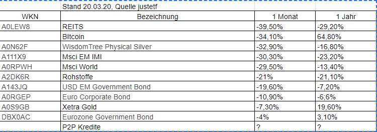 Bigwigster März 20, 2020 · bearbeitet März 20, 2020 von Bigwigster Also ich probiere gerade diesen Crash als Anlass zu nehmen ein paar Fehler zu erkennen und an meiner AssetAllocation zu feilen. Der größte und teuerste Fehler war wohl wieder besseren Wissens nicht alles Silber schon vor längerem zu verkaufen und in sinnvolle Assetklassen zu investieren. Gut jetzt bin ich klüger und hoffe den Dispositionseffekt zu trotzen. Auch habe ich mal einzelne Assetklassen unter dem aktuellen Einfluss von Corona betrachtet: Für den risikoreichen Anteil bleiben meiner Meinung nach abgesehen von Aktien als sinnvolle Beimischung noch übrig: Bitcoin, P2P Kredite, Gold Für den risikoarmen Anteil bleiben abseits von Festgeld/Tagesgeld noch EU Staatsanleihen (ja das ist keine Überraschung ) Besonders negativ überrascht war ich von den Schwellenländer Staatsanleihen, hier hätte ich mit weniger Drawdown gerrechnet. Meine Konsequenzen: Silber baldmöglichst verkaufen und in Aktien umschichten (dauert bestimmt ein paar Wochen/Monate da physisch vorhanden) Wenn das Depot wieder im +/- 0 Bereich ist auf den Einstandskurs bezogen (heutiger Stand circa -15%) mit Wiederaufbau des risikoarmen Anteils auf 25% beginnnen ohne Verkäufe von Aktien. Bei weiteren Rückgängen wird auch vom risikoarmen Teil in Aktien umgeschichtet. Diesen Beitrag teilen Link zum Beitrag