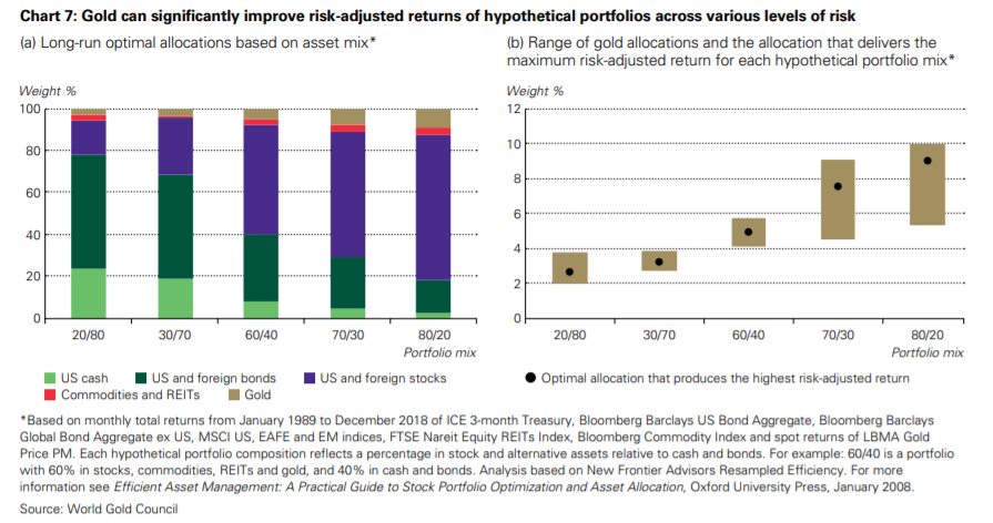 Bigwigster April 13, 2020 Im Moment habe ich mir nochmal ein paar Gedanken zu meiner Soll Asset Allocation gemacht. Insbesondere zu dem Goldanteil. Die festgelegten 15% beruhten größtenteils auf dem Rohstoffanteil des Areros und dem Marc Faber Portfolio (50% Aktien,25% Goldanteil,25%Staatanleihen) das mit einem Drawdown von real 29% geglänzt hat. Die günstigere Korrelation zu Aktien und höhere historische Rendite hat mich die Entscheidung gegen Rohstoffe und für Gold treffen lassen. Zu dem Thema habe ich nun noch eine sehr schöne Untersuchung vom World Gold Council gefunden: Quelle: https://s22.q4cdn.com/579360173/files/doc_news/2019/04/World-Gold-Council-Gold-as-a-Strategic-Asset-5.2.19.pdf Vom World Gold Council hätte ich eine deutlich höhere empfohlene Gewichtung erwartet und war deswegen sehr überrascht bei einem 70/30 Portfolio nur ein Empfehlung von circa 7% zu erhalten. Das zeigt mir zum einen, dass hier scheinbar tatsächlich relativ unbefangen an die Sache herangegangen wurde, zum anderen das meine Festlegung auf 15% zu hoch war. Ich habe mich jetzt erstmal dazu entschieden die Sollgewichtung auf 10% zu ändern. Das ist zwar immer noch höher als vom Gold Council empfohlen, allerdings habe ich auch keine Rohstoffe in meiner Asset Allokation, die dort zusätzlich aufgeführt werden. Damit wäre ich bei: 60% Aktien 10% Gold 30% Risikoarm. Das heißt erstmal für mich, dass nur der Edelmetallanteil noch Änderungsbedarf hat, hier werde ich weiter den Silberanteil reduzieren und durch Gold ersetzen. Diesen Beitrag teilen Link zum Beitrag