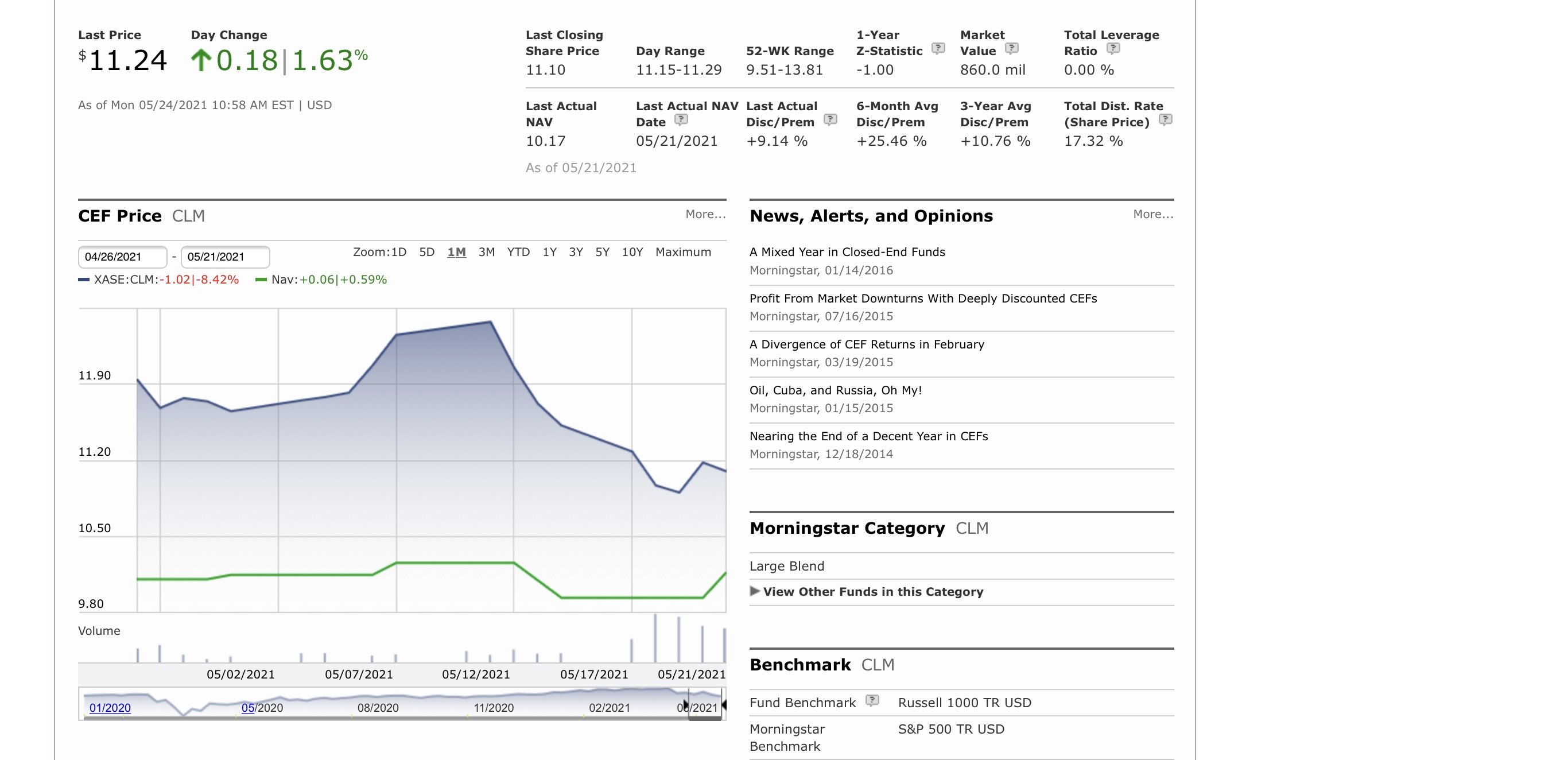 Zu CLM hatte ich ja bereits am 17.04. geschrieben. Die Position ist als Tradingposition gedacht, nachdem das Premium unter denn Durchschnitt der letzten 3 Jahre  von 10,76 % auf nunmehr 9,1x % gefallen ist, habe ich mich zum Kauf entschlossen. Am 17.04 lag der Kurs bei $ 11,99. Das Tief sollte bei $ 11,10 am letzten Freitag gelegen haben. So jedenfalls mein Plan.