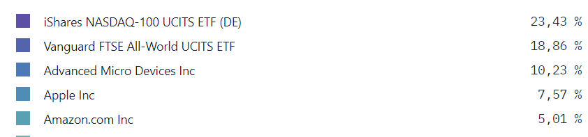 37,5% DA in ETF (S&P500IT und Nasdaq-100) --> Dadurch indirekt Apple (16,5% DA) , Microsoft (15,5% DA), die größten Positionen.