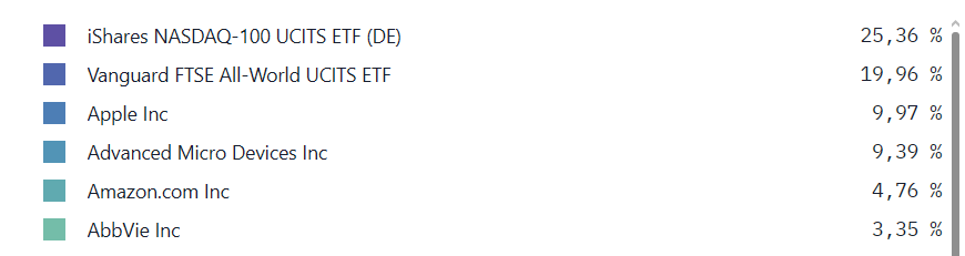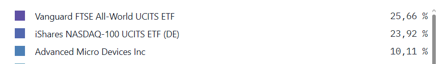 40,3% DA in ETF (S&P500IT und Nasdaq-100) --> Dadurch indirekt Apple (17,7% DA) , Microsoft (15,8% DA), die größten Positionen.