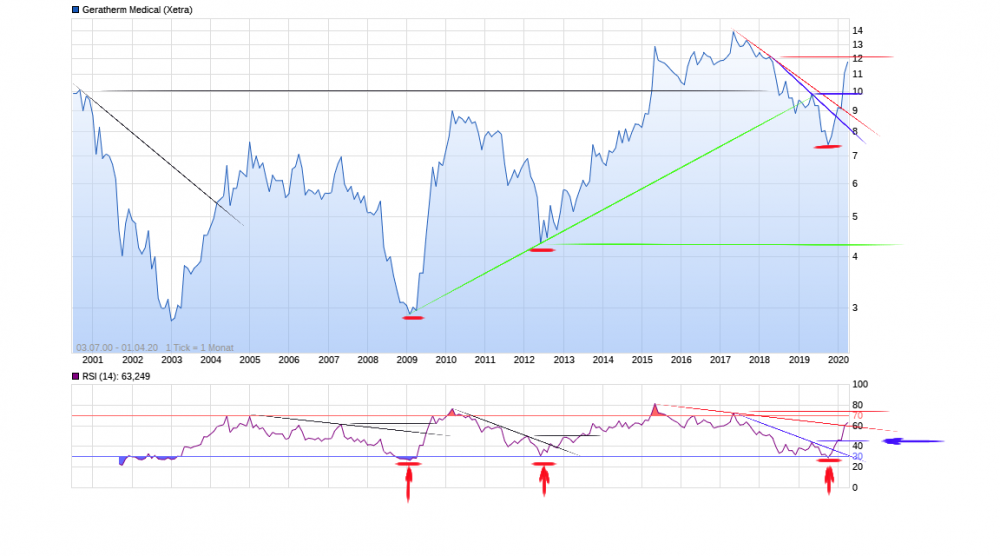 Die Bodenbildung ist aus charttechnischer Sicht ein absolutes Schmankerl. Die überverkauften Zonen im RSI auf Monatsbasis wurden jeweils ohne neue Tiefs im Chart erreicht ( Pfeile rot). Mit dem Ausbruch über die 10 € Marke wurde ein Kaufsignal generiert. Die neg. Divergenz (blau) im RSI wurde nach oben durchbrochen. Das gleiche gilt für den horiz. Widerstand (blau) im RSI, der oberhalb dieser Linie als überverkauft gilt (Pfeil blau).