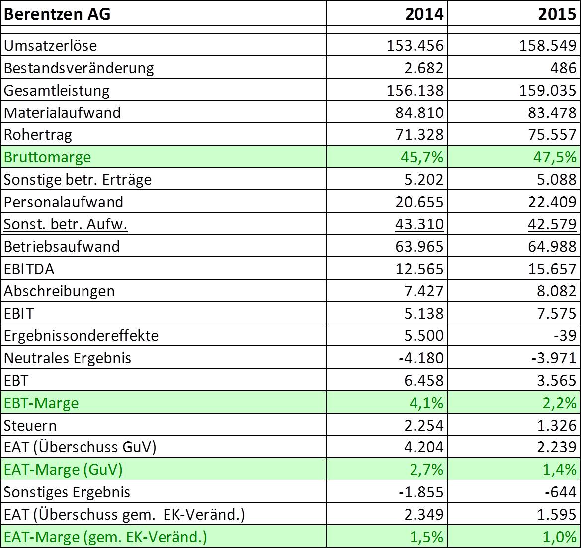 FrauMatzke Februar 1, 2017 Hier die bereits angekündigten vorläufigen Geschäftszahlen 2016: http://www.dgap.de/dgap/News/corporate/berentzengruppe-aktiengesellschaft-vorlaeufige-geschaeftszahlen-ergebnisprognosen-erreicht/?newsID=984537 Zusammenfassung: - Konzernumsatz steigt um 7,3 % auf 170,0 Mio. Euro - Konzern-Gesamtleistung um 8,6 % auf 172,7 Mio. Euro - Konzern-EBITDA erhöht sich um 11,5 % auf 17,5 Mio. Euro - Konzern-EBIT sogar um 38,2 % auf 10,5 Mio. Euro Diesen Beitrag teilen Link zum Beitrag