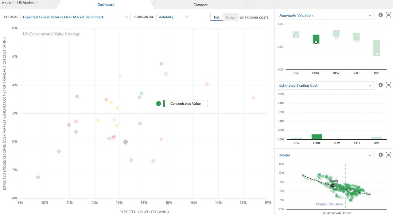 The Concentrated Value simulation selects companies from the Large + Mid Cap universe based on a value score, calculated using Price/Book, Price/Earnings, and Enterprise Value/ Cash Flow from Operations. Stocks are weighted by market cap times value score and are rebalanced semi-annually.
