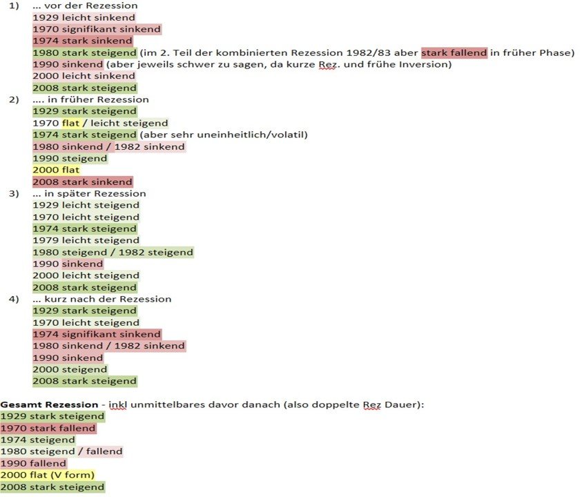 Bärenbulle April 23, 2020 · bearbeitet April 23, 2020 von Bärenbulle Die Goldperformance in früheren Krisen war weniger klar als man vielleicht denkt. Timing ist daher nicht einfach, selbst wenn man Rezessionsstart und Endedatum genau gekannt hätte. Die Entwicklung von Gold … Fazit: Nicht mal die Gesamtperformance von Gold über eine Rezession hinweg ist einheitlich, aber doch eher positiv. Vor allem die späte Rezession ist vglw. eindeutig positiv für Gold. Ein V-Form kommt überraschend häufig vor, aber auch durchgehend fallendes Gold kommt vor. Anfangs weniger steigend/uneinheitlich und später mehr steigend ist dann insgesamt auch ein erkennbares Muster. Erklärungsversuch:Vor der Rezession: unklares Bild (Gold uneinheitlich aber eher unattraktiv); Ursache vor allem steigende Zinsen und positiver Realzins.Frühe Rezession: In der frühen Phase der Rezession ist oft noch unklar, ob es sich um eine Rezession handelt (Teilnehmer schauen zurück / Wirtschaft brummt; 3 Monate Reportingverzug). Gold uneinheitlich.Späte Rezession: In der späten Rezession ist alles eindeutiger, dass es sich um eine Rezession handelt, Panik. Sinkende Zinsen Gold steigt.Nach der Rezession: sehr uneinheitliches polarisierendes Bild. Teils sehr starke Gewinne oder deutlich Verluste. Dazwischen fast nichts. Anscheinend ist die Konkurrenz zu Aktien (hausieren i.d.R.) oft zu stark (Anleger trenn sich wieder von Gold und schichten um). Zinsen sind niedrig. Die FED inflationiert teilweise extrem stark oder weniger (Gold explodiert oder fällt da Marktteilnehmen klar wird das die Rezession vorbei geht). Müsste man mal gesondert prüfen ob sich hier ein Muster aus Drittfaktoren ergibt. Diesen Beitrag teilen Link zum Beitrag