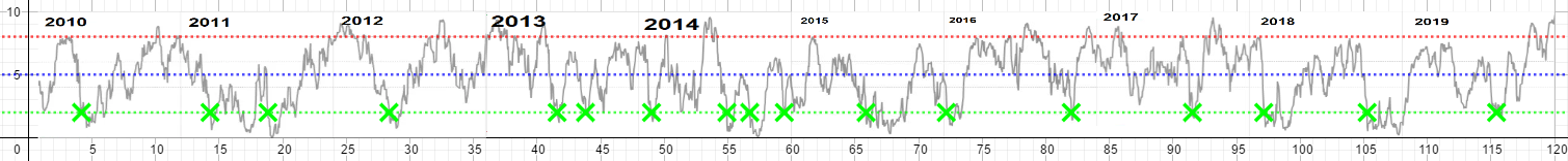 Nur die ersten Tage von 2010 fehlen, ansonsten sind jetzt alle Daten vorhanden. Den XTrackers-MSCI World habe ich auf den länger bestehenden thesaurierenden iShares-ETF (IE00B4L5Y983) umgestellt und alle Punkte neu eingefügt. Zur Vereinfachung habe ich Kaufsignale nach einem Kauf erst zugelassen, nachdem der F&G-Index wieder die Mittelmarke bei 50 überschritten hat. Dadurch liegt die Zahl der Käufe in 10 Jahren bei vertretbaren 17.