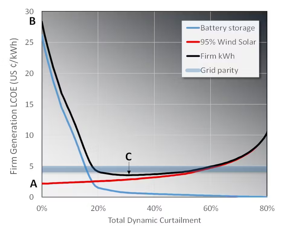 Influence of PV overbuilding on firm power generation LCOE. While unconstrained PV (A) is inexpensive (apparently below grid parity), firming PV to meet demand 24/365 with storage alone (B) is unrealistically expensive. Overbuilding PV fleets reduces storage requirements to the point (C) where firm PV power generation can achieve true grid parity (D). Source [24]