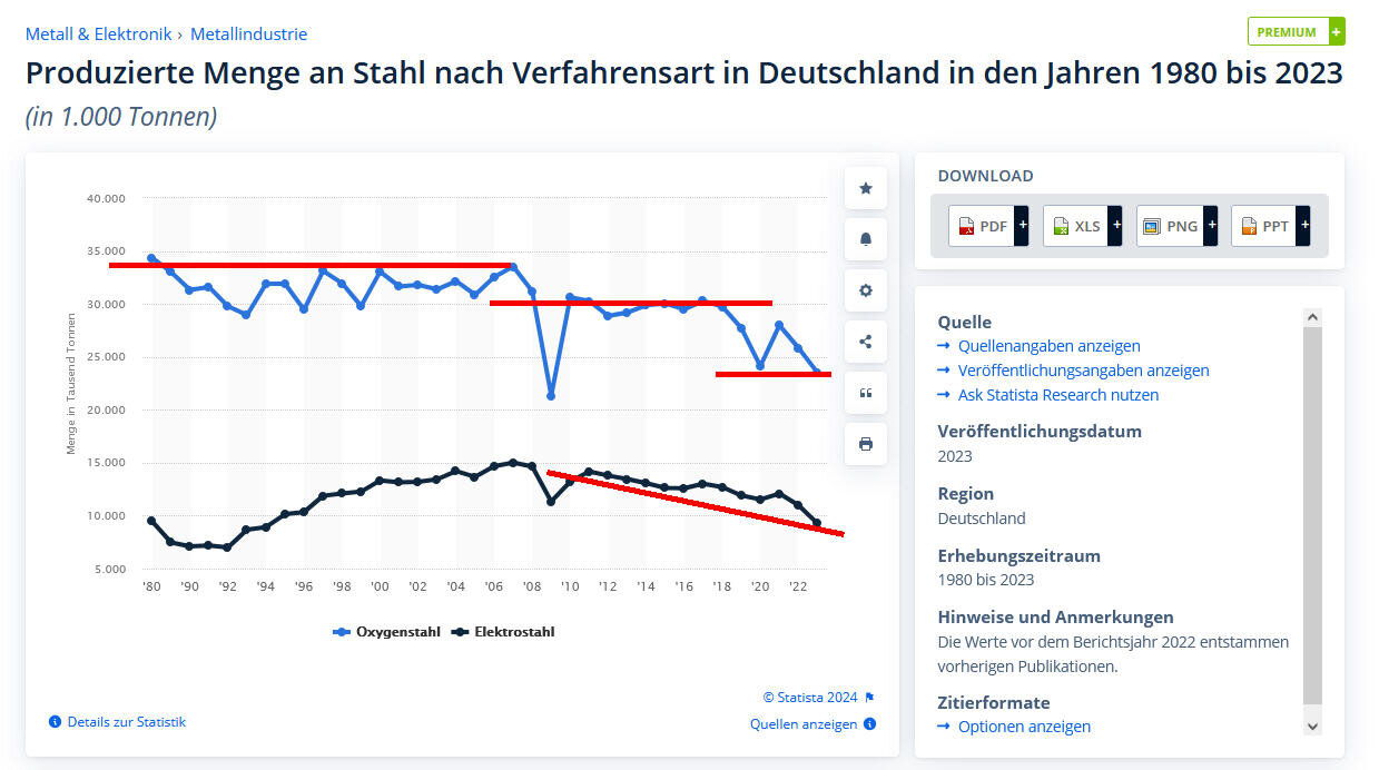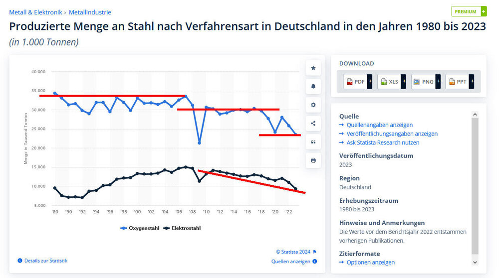 b. dass bei Elektrostahl der Peak 2006 erreicht war und es seitdem kontinulierlich runtergeht. Von 2010 bis 2015 zu einer Zeit wo noch gut Kohle- und Atomstrom da war.