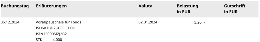 Geschichten aus der Baader-Welt: Für den IE000SIZJ2B2 wurde am 6. Dezember (!) 2024 noch eine Vorabpauschale für 2023 mit Valuta 02.01.2024 abgebucht und dann für fast die gesamte zweite Jahreshälfte Zinsen für gedultete Überziehung einkassiert, weil das Verrechnungskonto in dem Zeitraum überwiegend leer war.