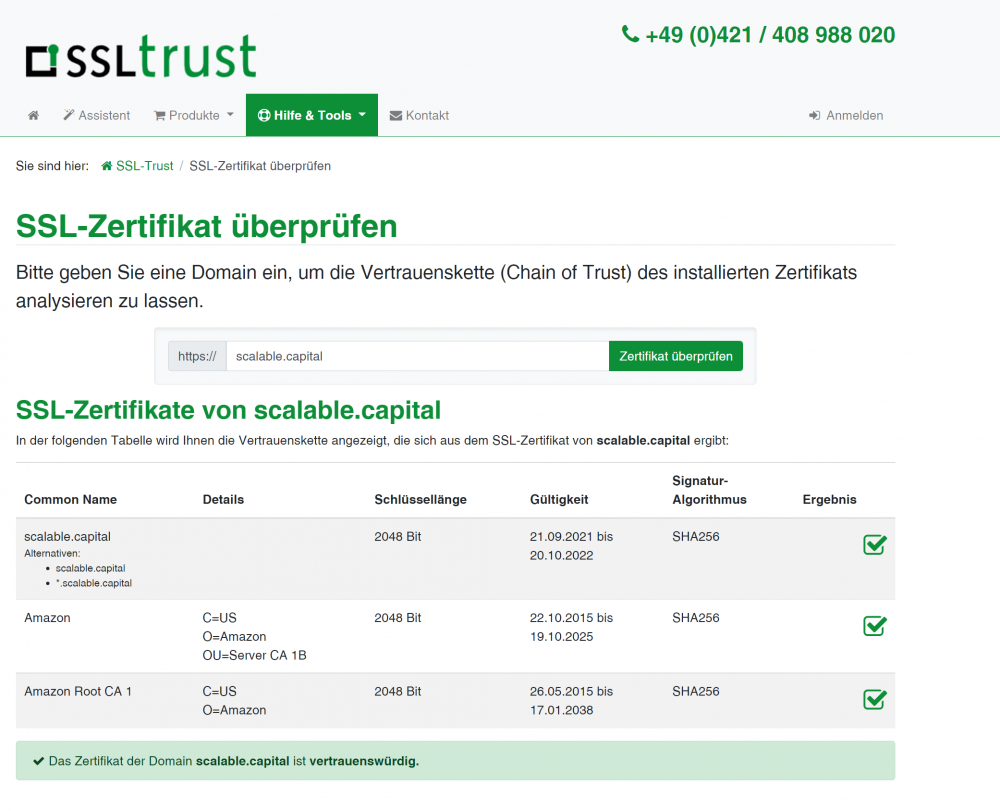 Egal wie ich auf https:// de.scalable.capital gehe, da ist ein gültiges Zertifikat, ausgestellt von Amazon. Laufzeit 29.04.21 bis 30.05.22