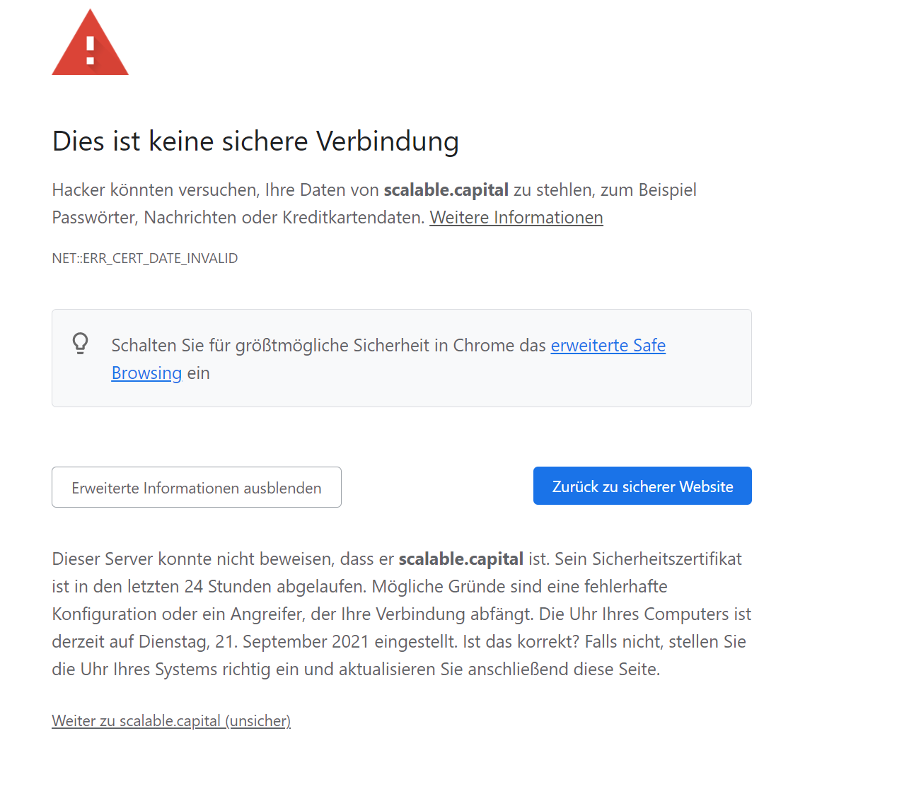 Die IT von Scalable hat inzwischen den Fehler gemerkt und auch umgestellt. Das neue SSL-Zertifikat läuft ab heute. Der Fehler ist damit behoben. Das hätte aber nie so passieren dürfen, sondern ist eine Schlampigkeit von Scalable.