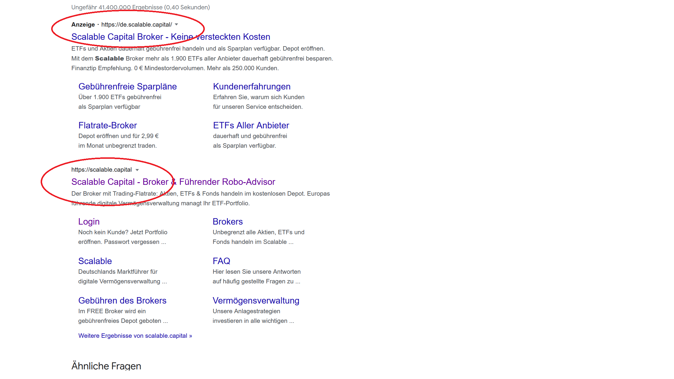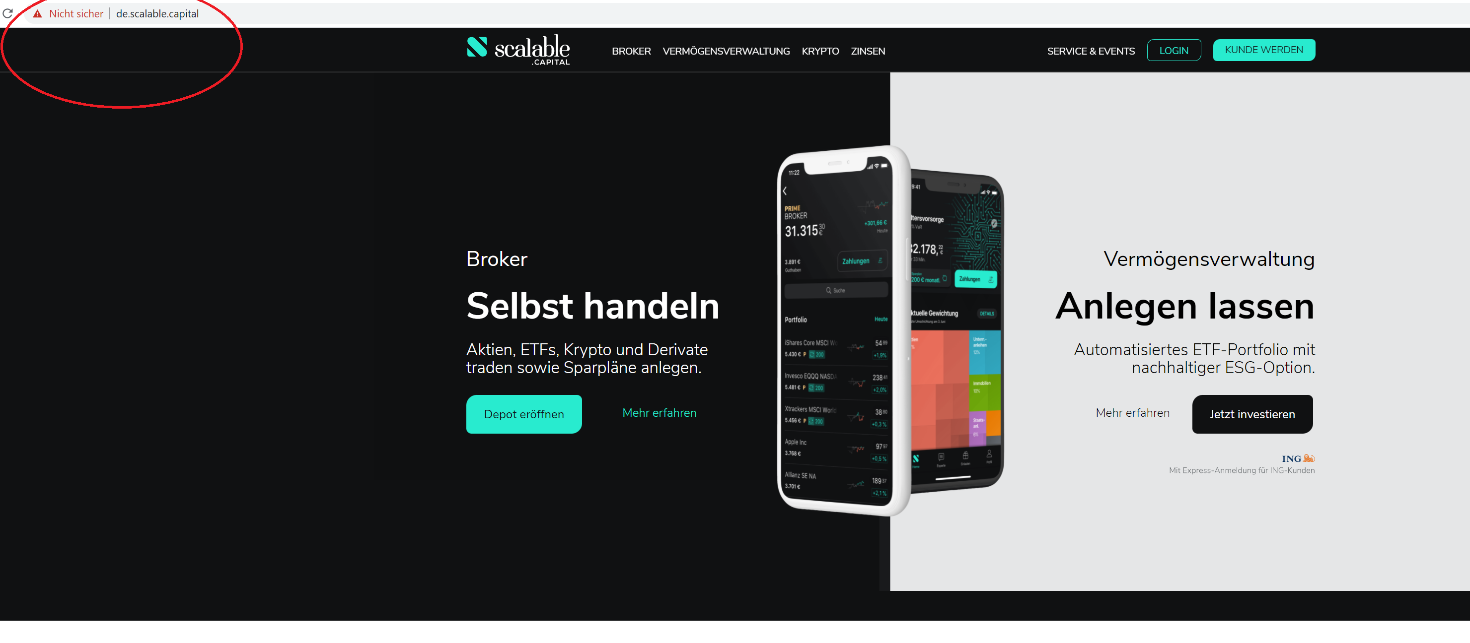Ich habe bei meinem Test Scalable Capital gegoogelt und habe dann darauf geklickt und bin direkt auf de.Scalable.capital umgeleitet worden.