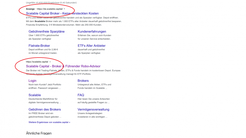 Weil scalable.capital deren Hauptseite ist. Du findest das auch so bei den organischen Suchtreffern (vgl. nachfolgenden Screenshot). Es gibt dann ein automatisches Redirect auf die Sub-Domain de.scalable.capital