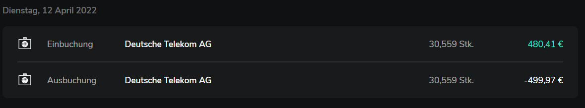 Bitte beachten Sie, dass in Ihren Transaktionen keine gesonderte Einbuchung einer Dividende stattfindet, da die steuerfreie Dividende über die jeweilige Ein- und Ausbuchung Ihrer Aktienanteile gutgeschrieben wird. Die Einzelheiten zu der Buchung entnehmen Sie bitte dem Dokument "Wertpapierereignisse" vom 13.04.2022 in Ihrer Mailbox."