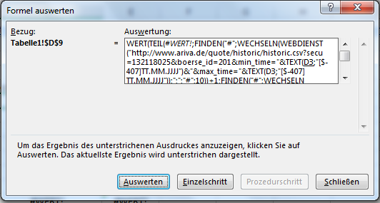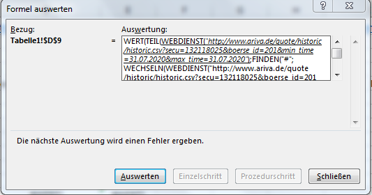 Oli Garch August 26, 2020 vor 27 Minuten von phlp112: Mein Problem ist, dass der erste Teil der Formel (erster Link) mit dem Fehler #WERT! zurückgegeben wird. Wenn ich aber den Link aus diesem Teil der Formel manuell in eine Excelzelle kopiere und den Link anklicke, öffnet sich eine neue Excel-Datei mit dem CSV-Download von Ariva, wo die Zahlen korrekt drin stehen. Ich verwende Excel 2019. Der Unterschied dürfte nicht allzu groß sein. Eine Idee habe ich noch: Der Wert, der ausgelesen wird, wird zunächst als Text erkannt und anschließend mit der Funktion WERT in einen Zahlenwert umgewandelt. Das scheint bei dir nicht zu funktionieren. Entferne mal zur Probe ( " WERT( " ) am Beginn der Formel und hinten die letzte Klammer. Dann müsste eigentlich in der Zelle der korrekte Wert als Text (linksbündig) angezeigt werden. Wenn das so ist liegt es irgendwie an deinen Einstellungen in Excel, oder auch nur an der Zellenformatierung. Diesen Beitrag teilen Link zum Beitrag