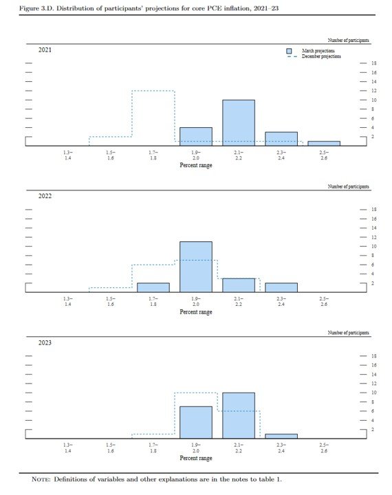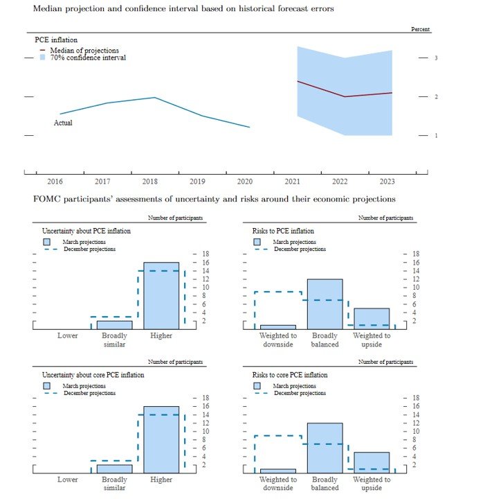 Trotz der höheren Inflationserwartungen haben die US-Notenbanker ihre Zinserwartungen nicht verändert. Demnach rechnen sie für die Jahre bis 2023 nach wie vor mit Leitzinsen an der Nullmarke.
