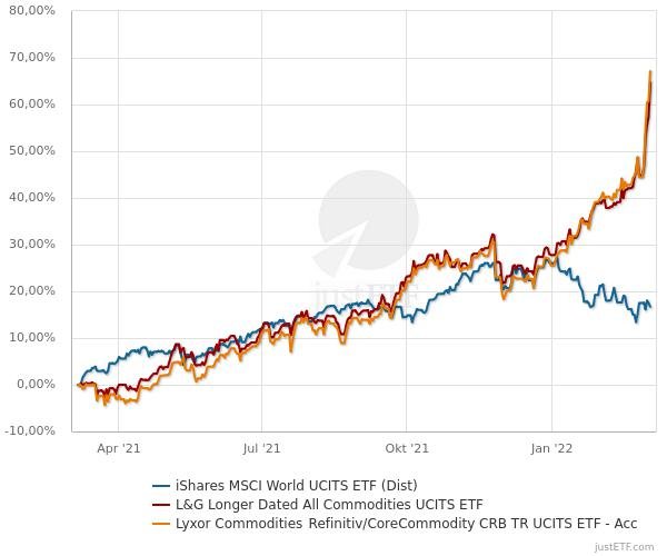 Sapine März 7, 2022 vor 46 Minuten von Matunus: Hier die Fortsetzung (ohne jetzt irgendeine Sinnhaftigkeit zu beurteilen, rein als Serviceleistung): edit: Die ISINs müssten IE00B0M62Q58 und LU1829218749 sein. Merci - die Sinnhaftigkeit von Vergleichen ist oft nicht gegeben. Aber wenn zuvor nur auf den Einjahresvergleich abgezielt wurde, zeigt diese Abbildung, dass man damit deutlich zu kurz springt. Und je nach Start-/Endzeitpunkt solcher Betrachtungen kommt man zu völlig unterschiedlichen Beurteilungen. Persönlich würde ich gerne neben der kleinen Schippe Gold auch noch Commodities mit reinnehmen, aber es ist wohl ziemlich schwierig. Nicht nur dass man kaum einen vernünftig konstruierten ETF findet sondern es spielen auch ethische Probleme mit hinein beispielsweise im Bereich Lebensmittel sofern inkludiert. Diesen Beitrag teilen Link zum Beitrag