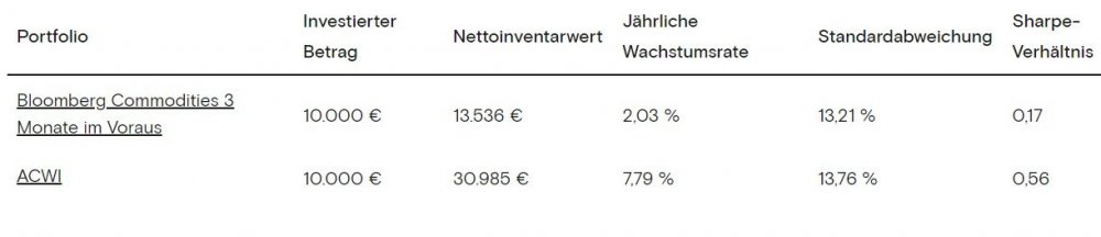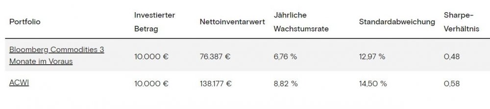 Matunus März 7, 2022 · bearbeitet März 7, 2022 von Matunus vor 22 Minuten von Sapine: geht auch ab 2007? Denn das war ja die Vorlage Am 9.6.2021 um 16:26 von DST: Der Verzicht auf Rohstoff-ETFs hat mich jedenfalls bisher kein Geld gekostet Hier die Fortsetzung (ohne jetzt irgendeine Sinnhaftigkeit zu beurteilen, rein als Serviceleistung): edit: Die ISINs müssten IE00B0M62Q58 und LU1829218749 sein. Diesen Beitrag teilen Link zum Beitrag
