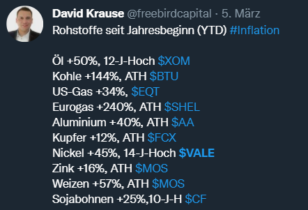 cutter111th März 7, 2022 · bearbeitet März 7, 2022 von cutter111th vor 40 Minuten von Sapine: Nun ich habe die Tabelle von herbert_21 interpretiert und bin zu einem völlig anderen Ergebnis gekommen als Du. Ohne den Anstieg der letzten Wochen wären die Commodities immer noch nahe der Nulllinie. Bei dir liest sich das so, als würden Rohstoffe erst seit Ausbruch des Krieges steigen, da frage ich mich, in welchem Loch du dich die letzten 12 Monate versteckt hast. Rohstoffe sind schon über das gesamte Jahr 2021 sehr stark gestiegen und das hatte mal so überhaupt gar nichts mit der Ukraine Krise zu tun. Die Ukraine Krise hat die ohnehin schon kritische Situation nun nur noch mal verschärft. Was glaubst du denn, wo die Inflation herkommt? Gerade das zweite Halbjahr 2021 war bei vielen Rohstoffen wie Gas, Kohle, Magnesium etc. schon heftig. Andere Rohstoffe sind schon weit länger knapp, zum Beispiel Holz. Schon im Oktober sind wegen der hohen Strompreise die ersten energieintensiven Fabriken vom Netz gegangen, zum Beispiel für Aluminium oder Düngemittel. Bei Aluminium kam erschwerend hinzu, dass es an Magnesium fehlte, weil China einen Exportstopp verhangen hatte, ebenso für Silizium. Das es schon im Herbst keine Kohle mehr gab, hast du schon mitbekommen oder? Stromkrise im Herbst in China, auch nichts von gehört? Wir hätten aktuell auch ohne Krieg riesige Probleme und das war schon spätestens im Herbst absehbar, alleine wegen der explodierenden Strom- und Gaspreise, Der Gaspreis hatte sich bis Dezember verzehnfacht. Das die ersten Gas- und Stromversorger schon vor Weihnachten in Insolvenz gegangen sind, tausende Kunden gekündigt wurden und Grundversorger Preiserhöhungen von zum Teil mehreren hundert Prozent zum Jahreswechsel angekündigt hatten, hast du auch nicht mitbekommen? Das hatte absolut null mit der Ukraine-Krise zu tun. Die explodierenden Strompreise im letzten Jahr hatten unter anderem auch mit einer sehr ungewöhnlichen Windflaute zu tun. Fast 30% weniger Strom konnte durch Windkraft erzeugt werden, was zur Folge hatte, dass hier Kohlekraftwerke einspringen mussten, durch den Co2 Preis wurde der Spaß dann richtig teuer Schon im Dezember sprach man selbst bei der EZB von einer Green-Inflation, weil man erschrocken feststellen musste, dass für den geplanten Wandel gar nicht genug Rohstoffe da sind. Es gab doch schon vor Wochen die ersten Talkshows zum Thema Inflation und explodierende Energiepreise. Da wurden die Grünen doch schon von der Realität eingeholt. Unter diesem Gesichtspunkt ist der Krieg auch nicht gut, denn dieser wird jetzt immer als Ausrede dafür herhalten müssen, dass die Grünen das Gegenteil von dem tun was sie immer gepredigt haben. Diesen Beitrag teilen Link zum Beitrag