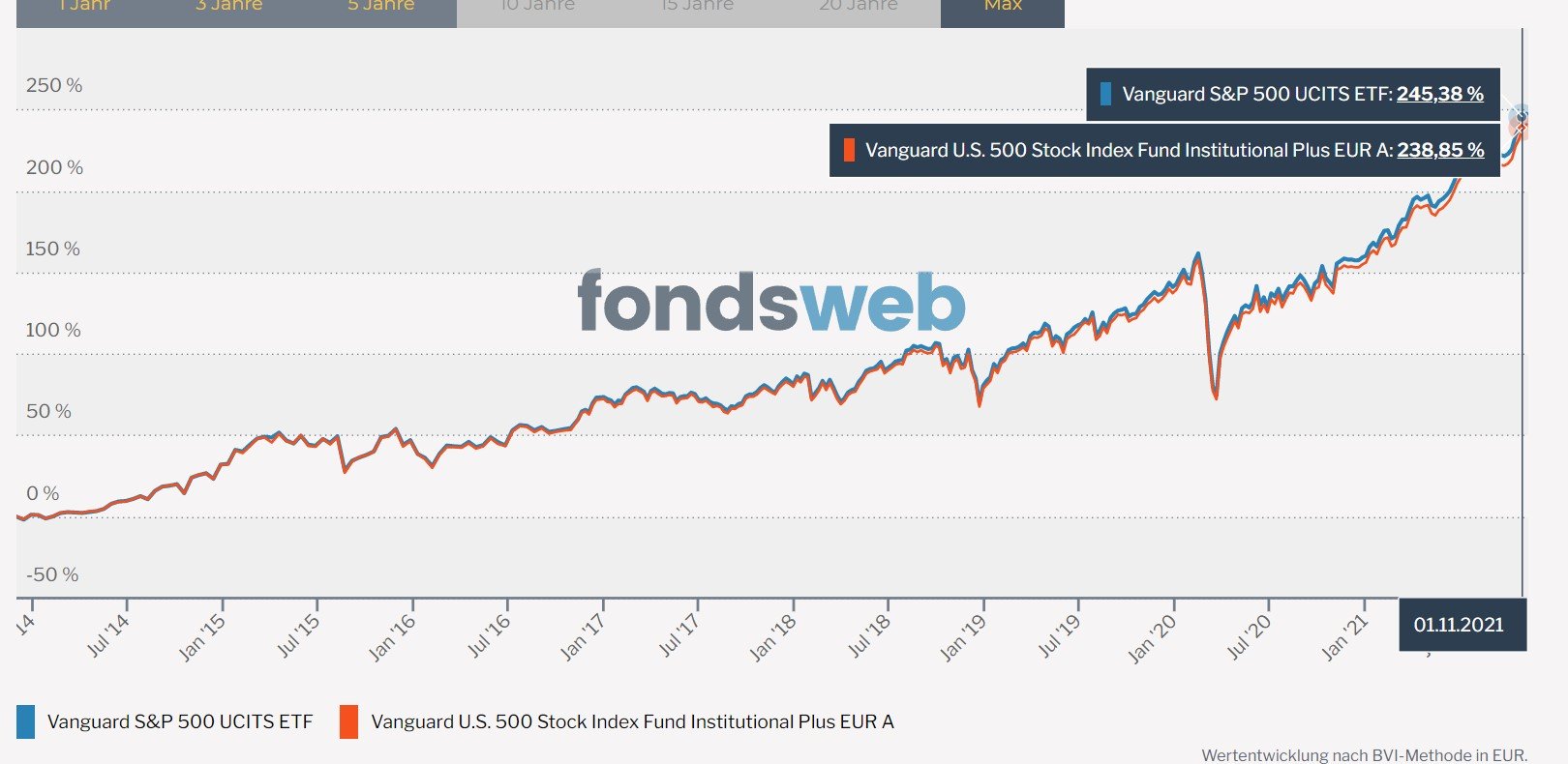 Die Insti-Klasse hat sogar noch niedrigere Gebühren als der ETF und trotzdem ist die Performance schlechter und das, je länger der Rückblick ist.