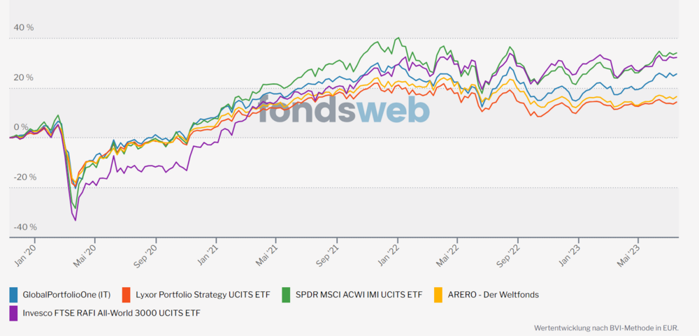 Oder hier dann die Entwicklung seit Auflage des GPO und nicht seit Auflage des Vanguard Lifestrategy, also immerhin noch ein Jahr länger (inkl. dem Invesco RAFI, der die USA ähnlich gewichtet wie das GPO).
